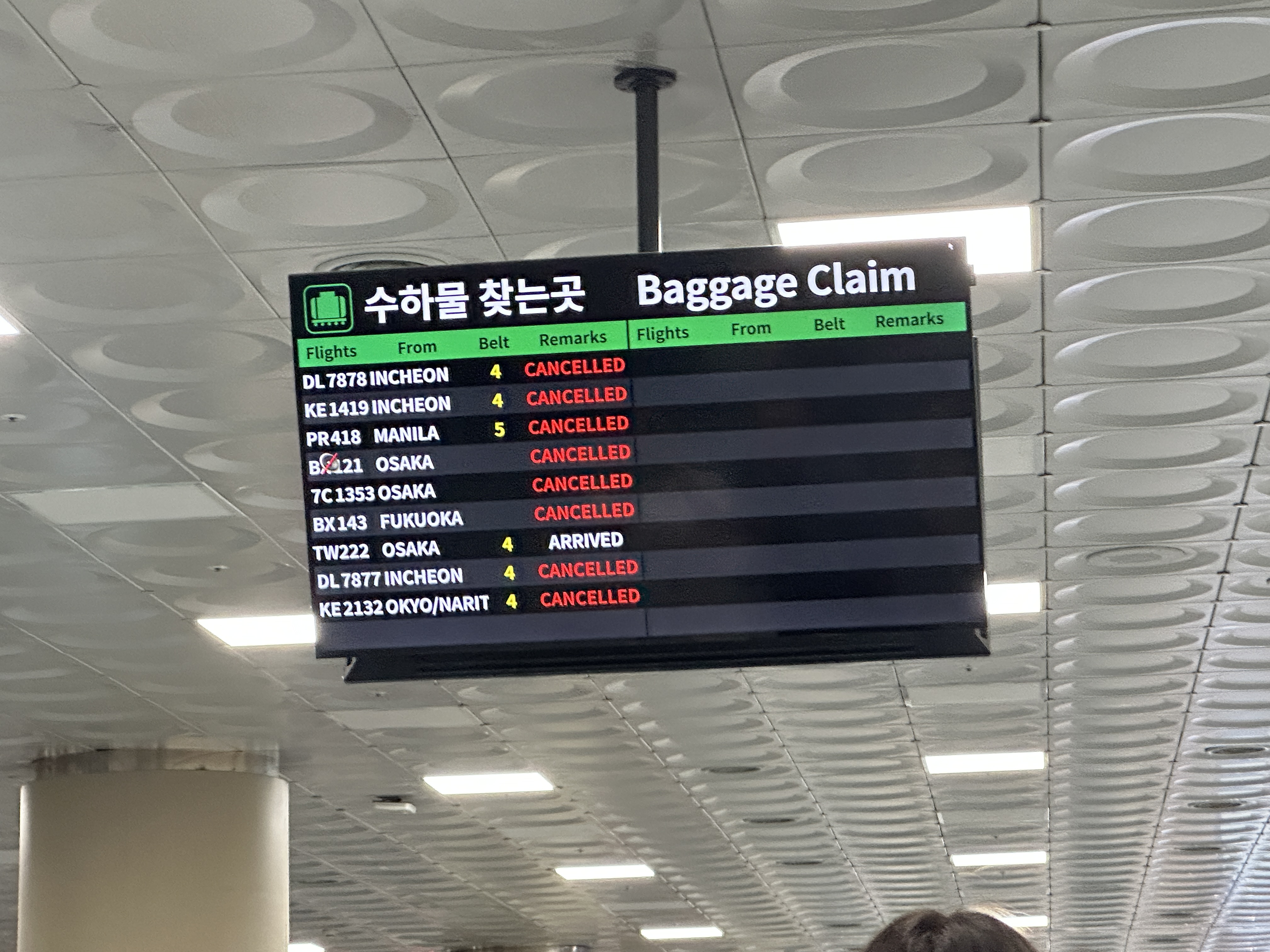 무서웠지만 생각보단 무사히 도착했음.. 그리고 승객들이 무사히 내려서 박수쳤던걸로 기억함 ㄷㄷ... 기장님도 착륙하고 나서 태풍 때문에 걱정하셨을 텐데 잘 도착했다고 방송하셨음. 그리고 김해공항에 내리고.. 수하물 찾는 곳 모니터를 봤더니 타고 왔던 티웨이 항공기 외에 전부 다 결항된 걸 볼 수 있었다. Arrived라고 써있는 저 비행기를 타고 왔네요ㅋ.. 같은 비행기 타고 온 사람들 전부 모니터 앞에서 사진 찍고 있었다. 거의 포토존.. 무섭고 신기하고 짜릿한 경험이었다. 참고로 도착한 다음날 엄마가 일정 있다고 태풍 뚫고 버스 타고 서울 바로 올라옴. 무슨 동선이 태풍경로랑 똑같음ㅠㅠ