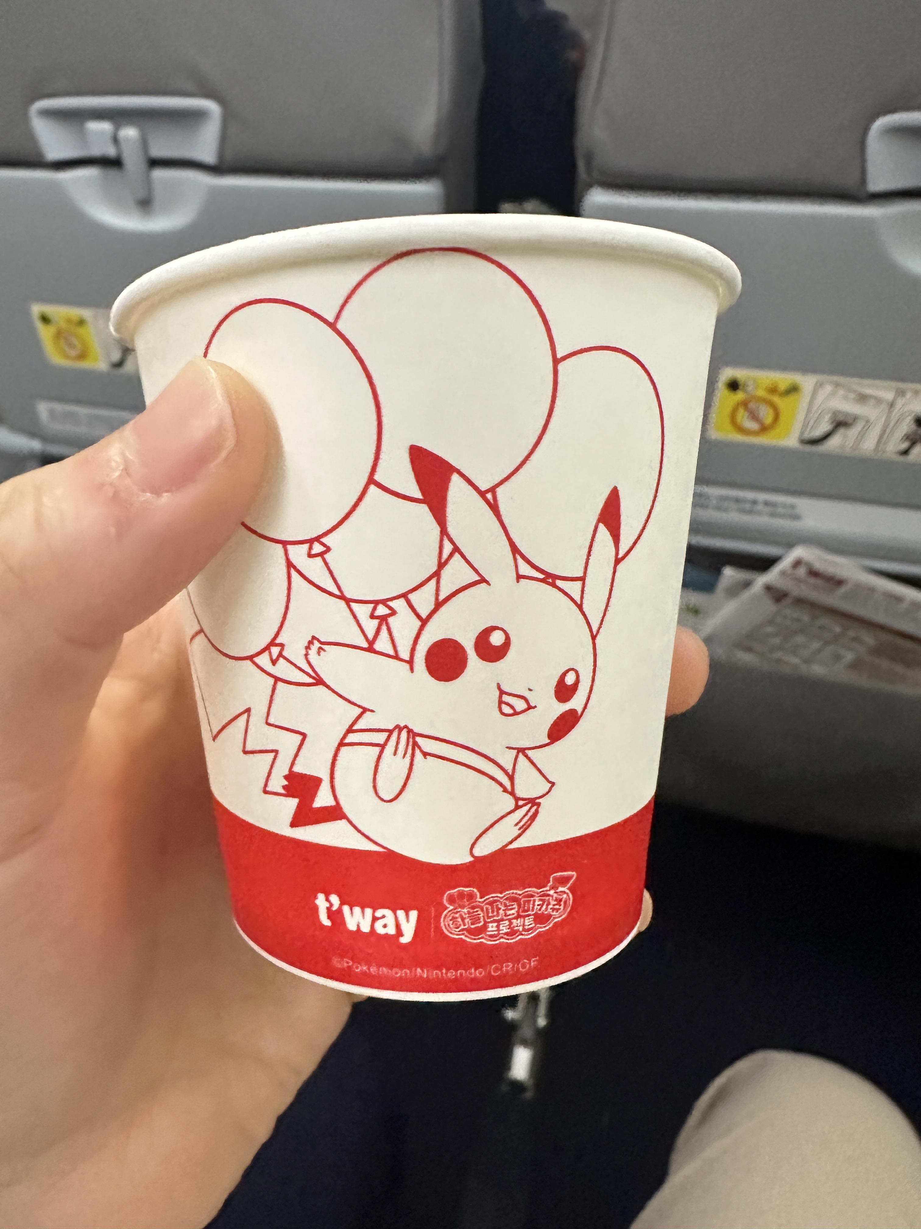 엄마는 올 때 창가자리 못 앉은 게 속상했는지 밖에 사진 열심히 찍으셨다. 나는 티웨이 항공의 귀여운 삐까츄 종이컵을 찍음