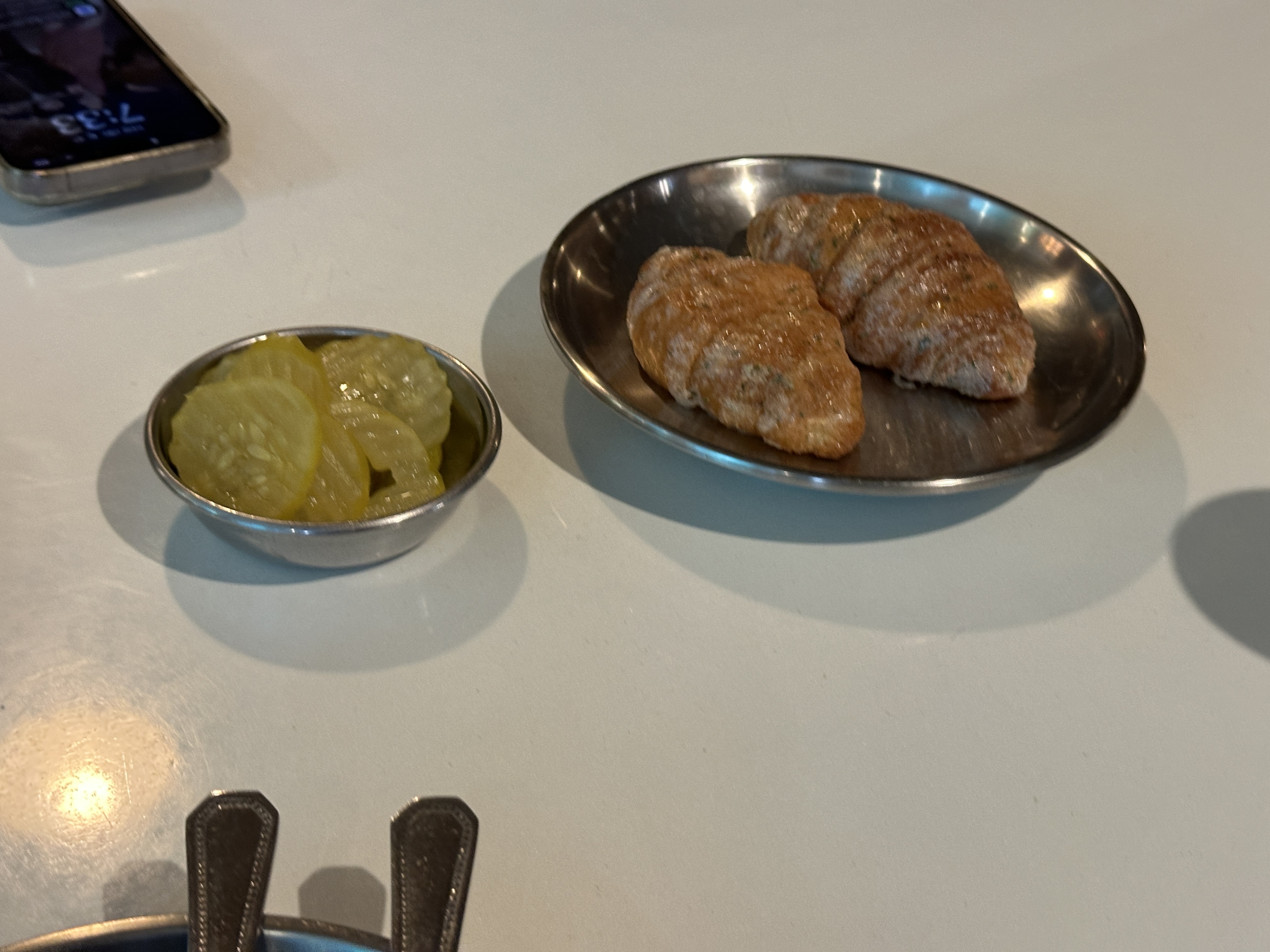 메뉴가 나오기 전에 식전빵도 나오고요. 이 가격에 식전빵까지 주는 게 감동이네요.. 크로와상 생지에 마늘빵 소스가 발려져 있었고 달달한 크로와상 맛이었어요.
