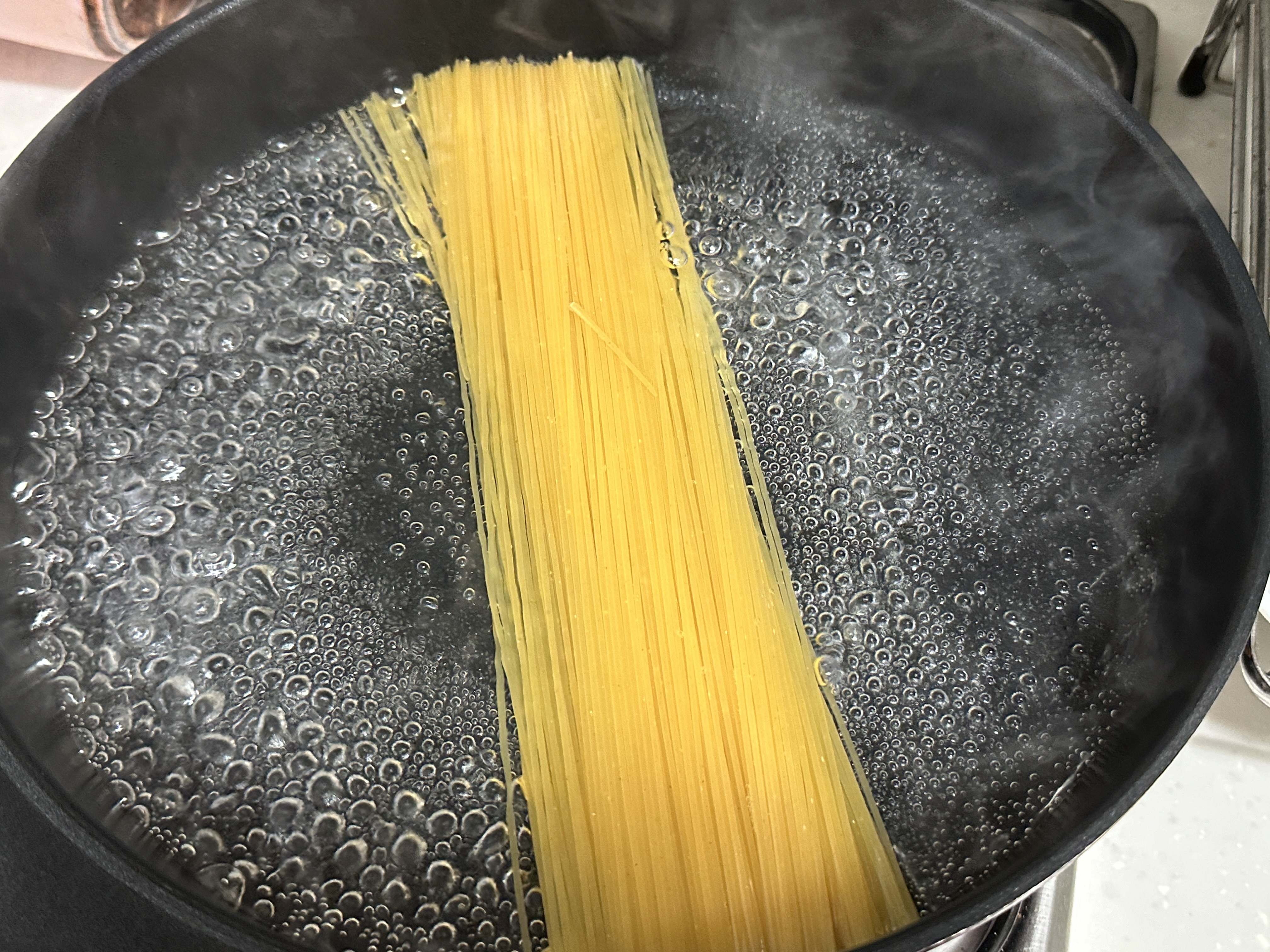 메밀면이 아닌 얇은 파스타면 잘 삶아줍니다.