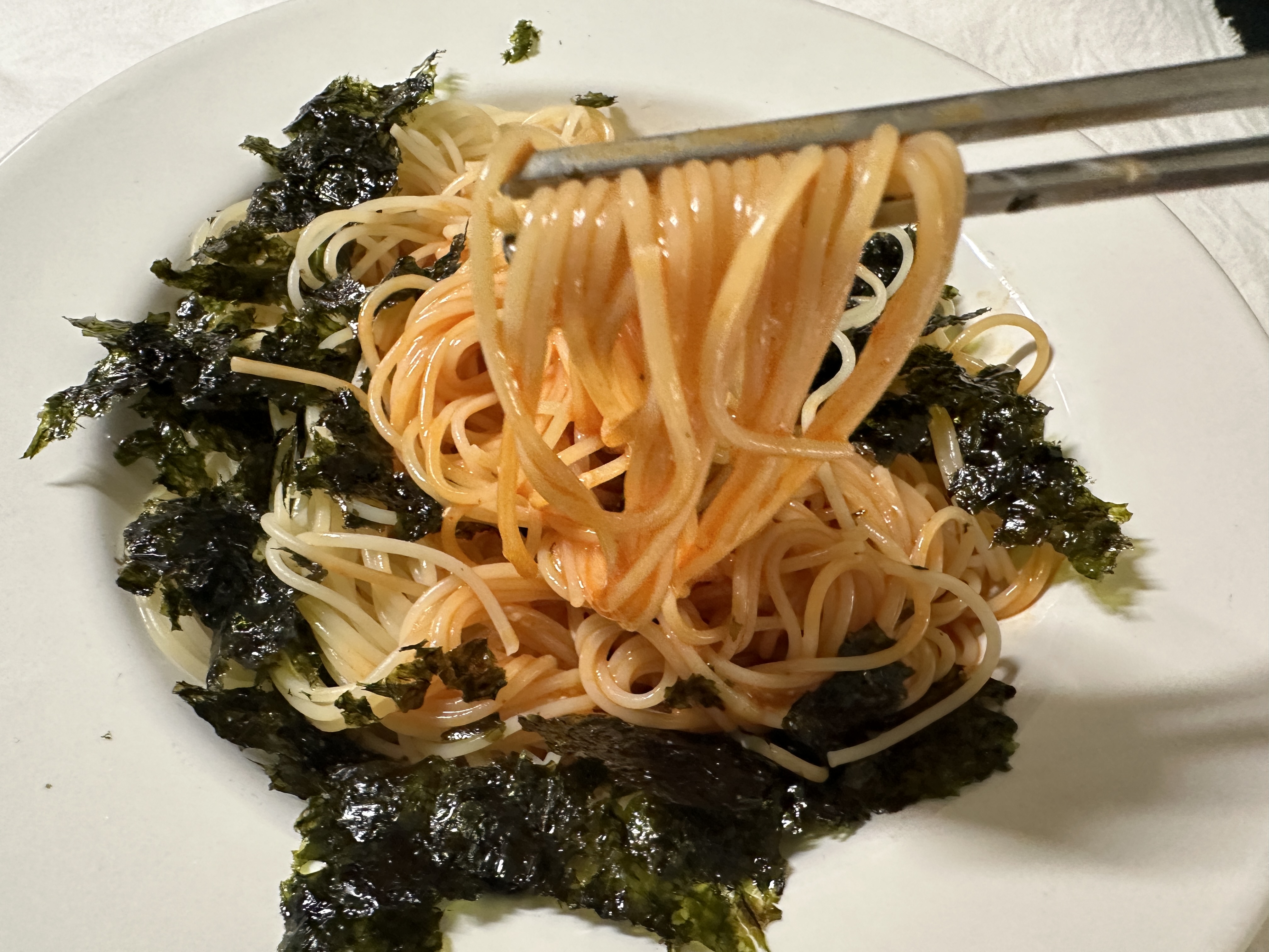 다이소 계란노른자 분리기도 사용해서 노른자도 넣어줍니다. 그리고 파스타 면에 소스를 부워서 잘 비벼줬습니다. 그리고 위에 정국님이 아니라고 한 도시락 김 김가루까지... 솔솔 뿌려줍니다..