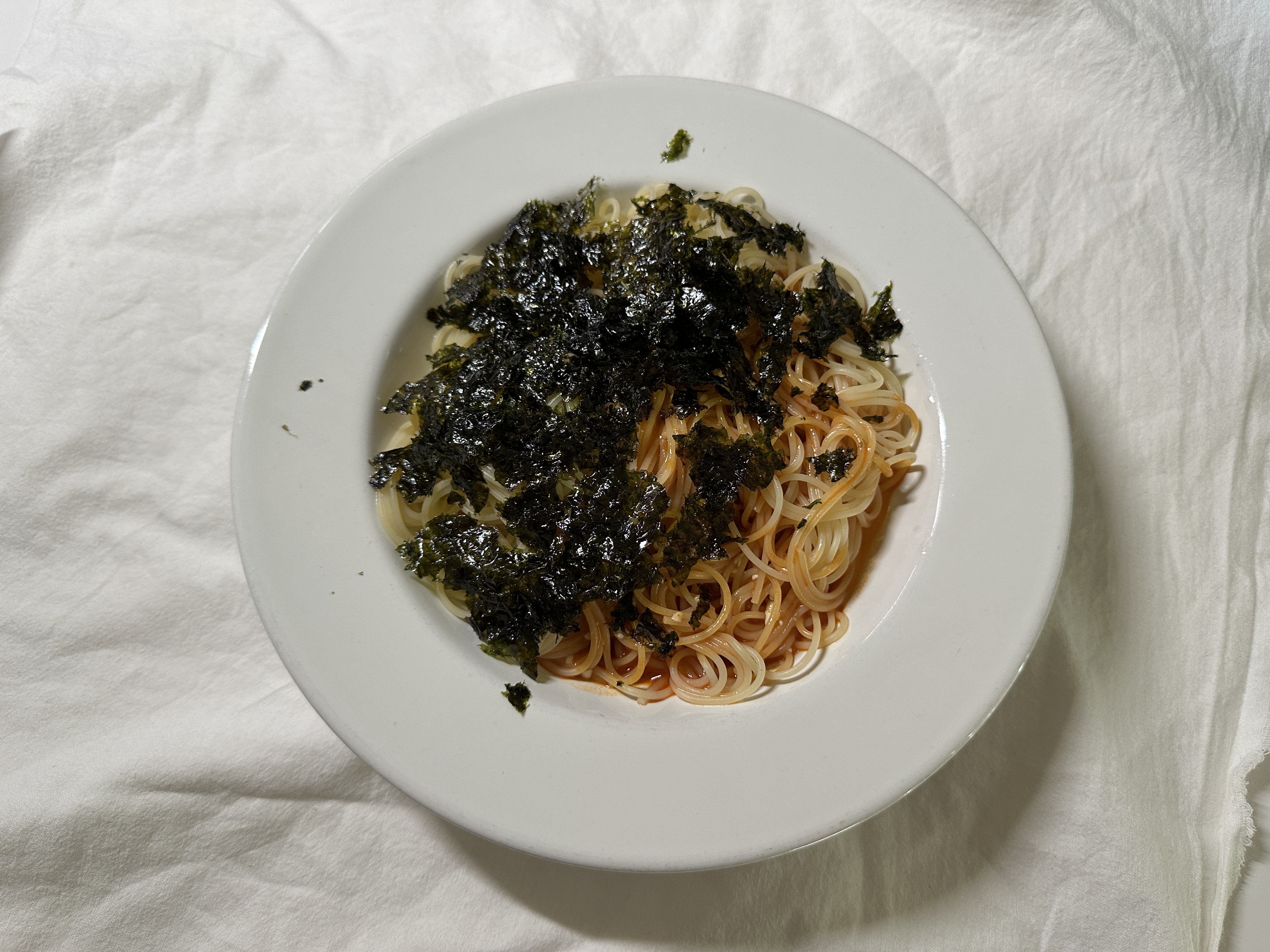 정국 들기름 막국수에 참소스 없이, 직접 만들어서 넣고 김가루 뿌린 하지 말란 거 다 넣은 정국 들기름 막국수가 완성되었습니다. 놀랍게도 면은 파스타 면이죠. 껄껄