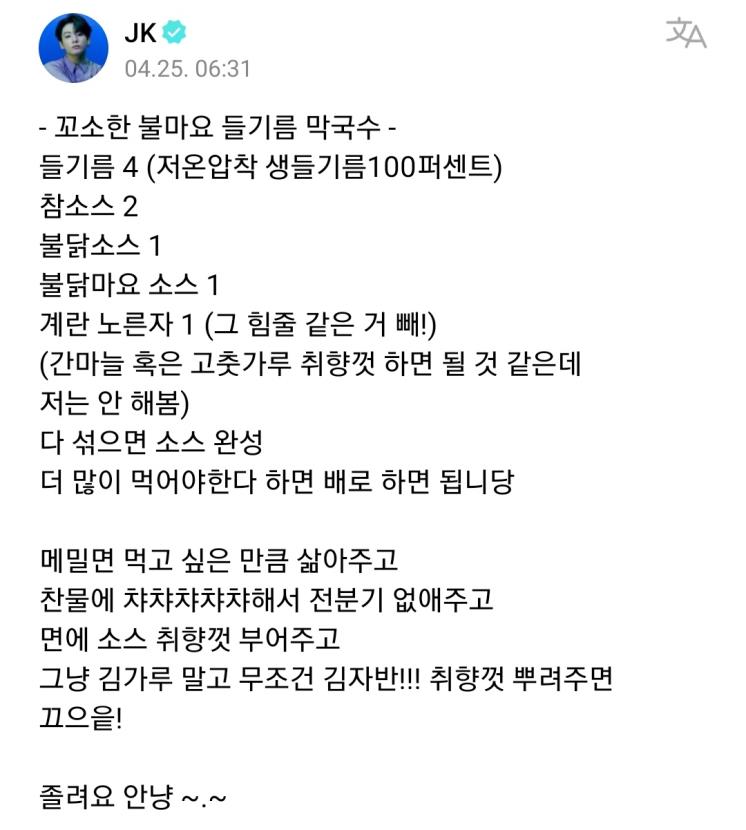 꼬소한 불마요 들기름 막국수 재료. 정국님이 위버스에 올린 글입니다.