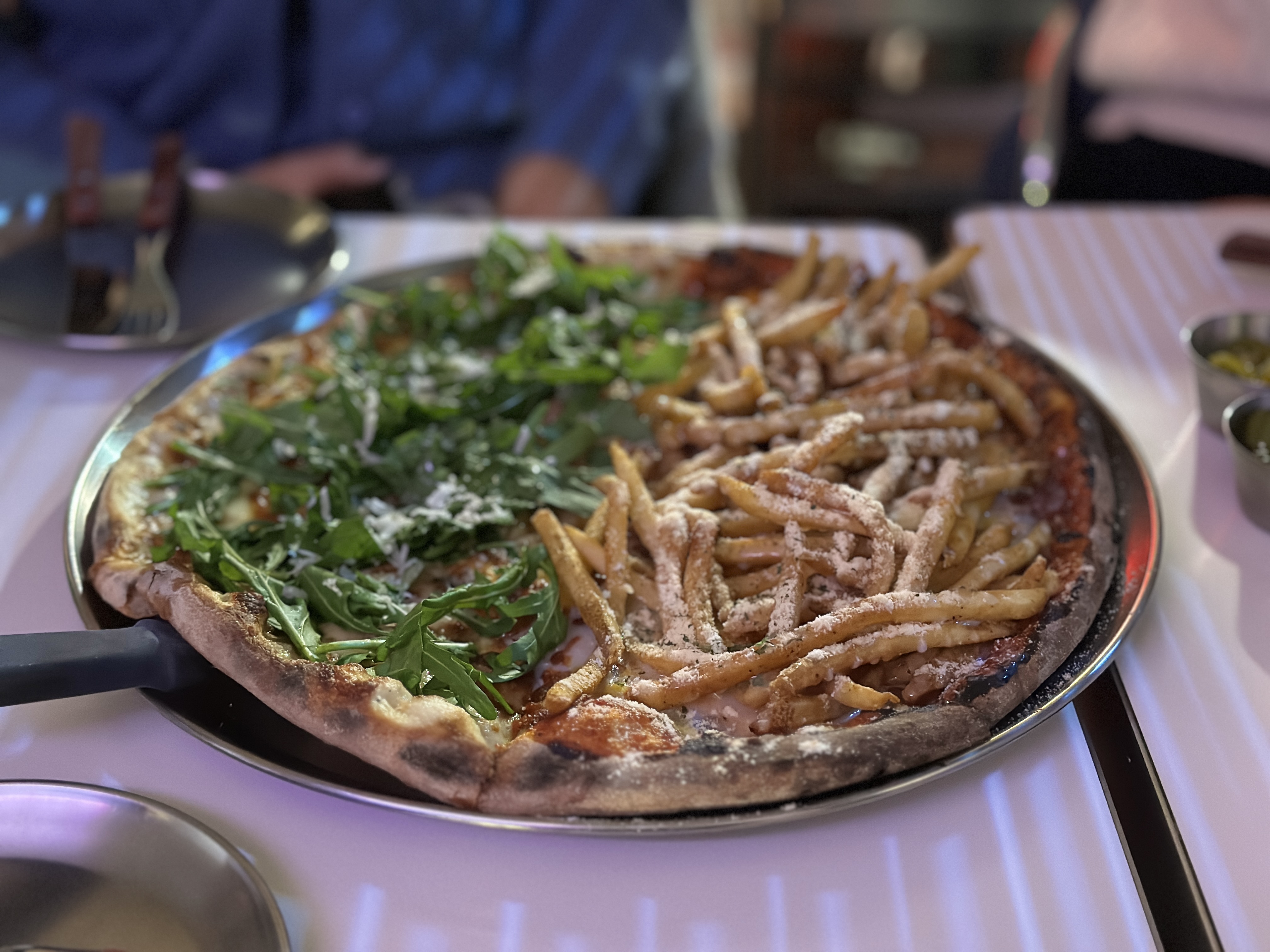 풍자 set인 트러플 루꼴라와 포테이토 반반입니다. 포테이토 맛은 감자튀김이 잔뜩 올라가서 좀 치트키 같았고요. 위에 올라간 시즈닝이 양념감자 같아서 맛있었습니다. 루꼴라 피자도 트러플향과 신선한 루꼴라 조합이 맛있었어요. 뉴오더클럽에서 뭐 먹을지 고민이면 풍자처럼 먹어봐도 좋을 거 같아요. 조합 맛있었습니다. 피자가 두 조각 남아서 포장도 요청드렸는데 잘 포장해 주셔서 집에서 먹을 수 있었어요.