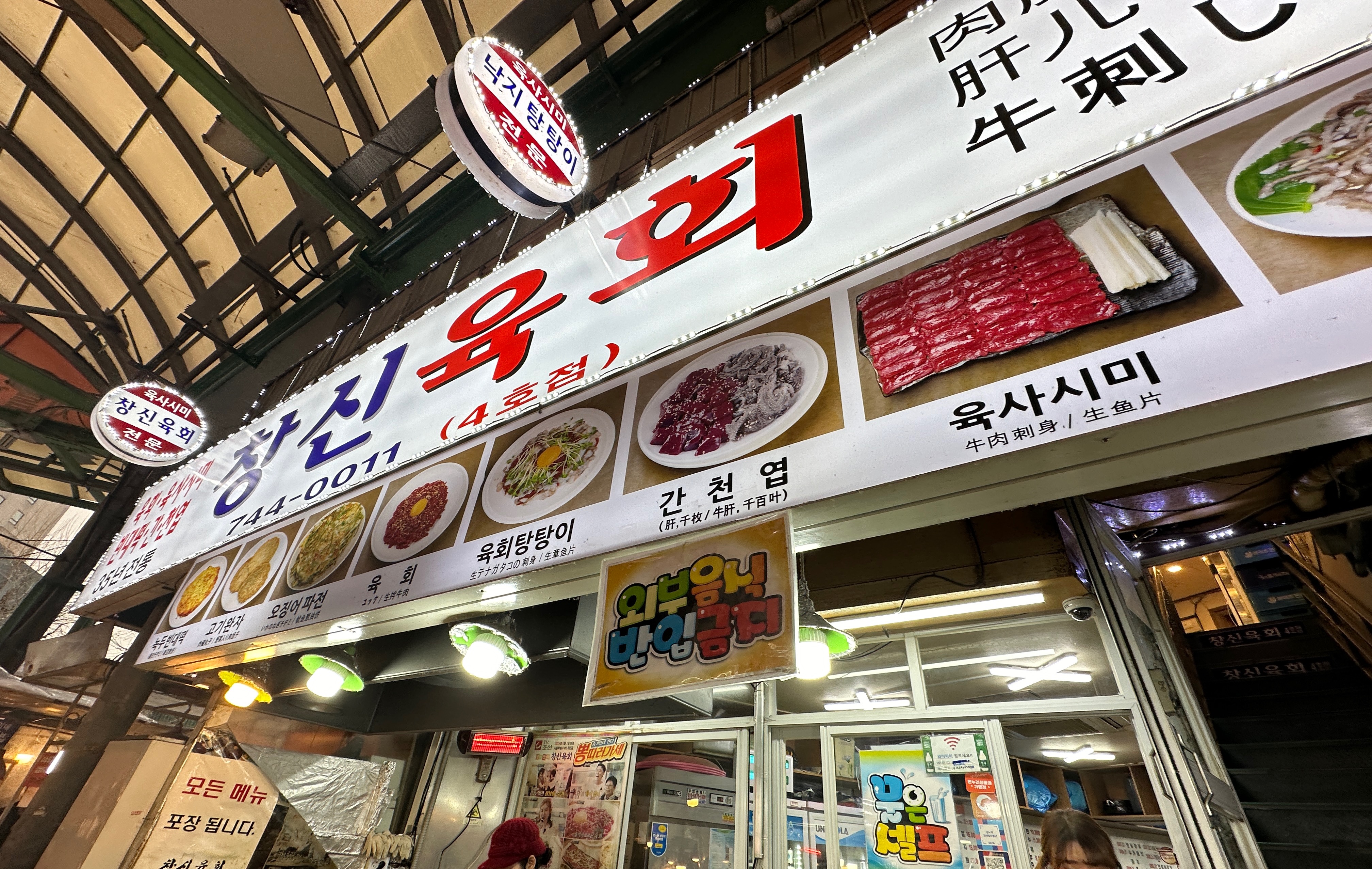 저는 창신육회는 처음 와봤고 자매육회를 몇 번 가봤었는데요. 오랜만에 방문한 광장시장 입구에 창신육회 4호점이 있더라고요. 보이는 곳으로 바로 들어갔어요~