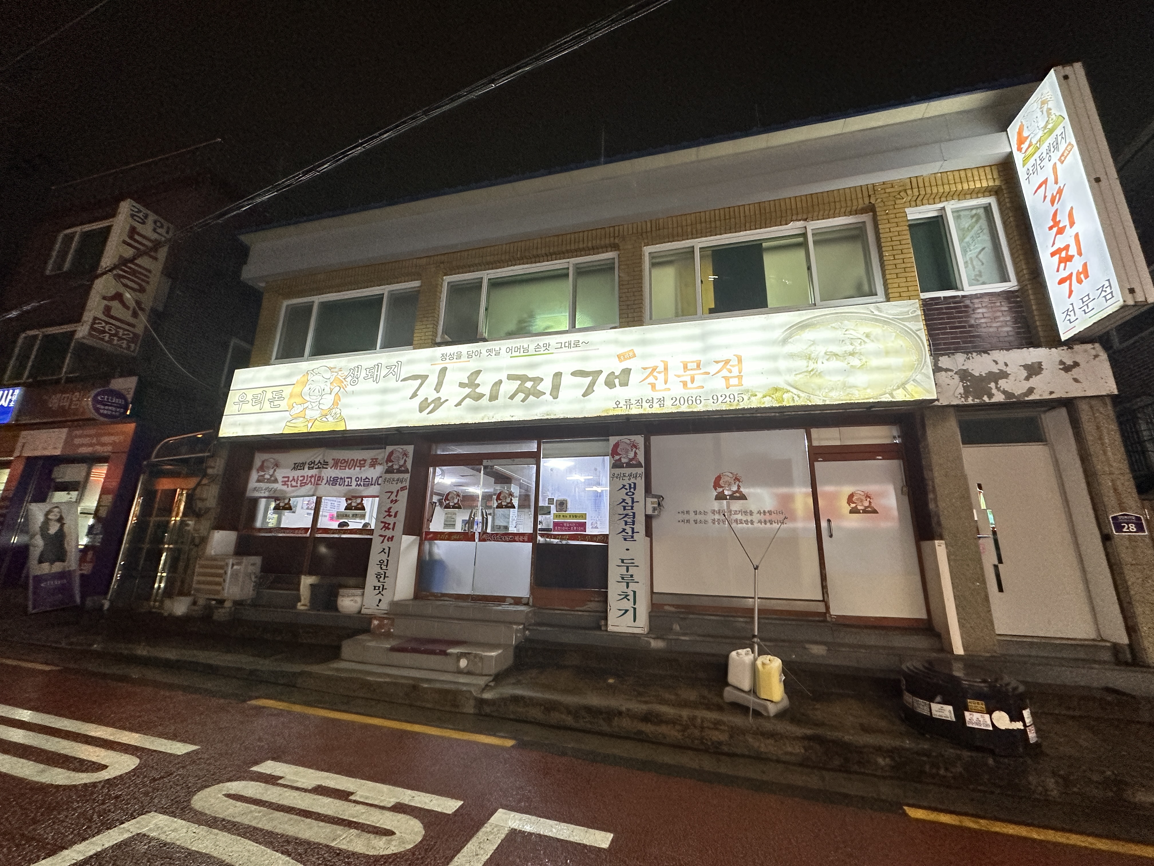 오류동 숨은 맛집, 우리돈 생돼지 김치찌개 외관입니다. 세월의 흔적이 느껴지는 간판이에요.