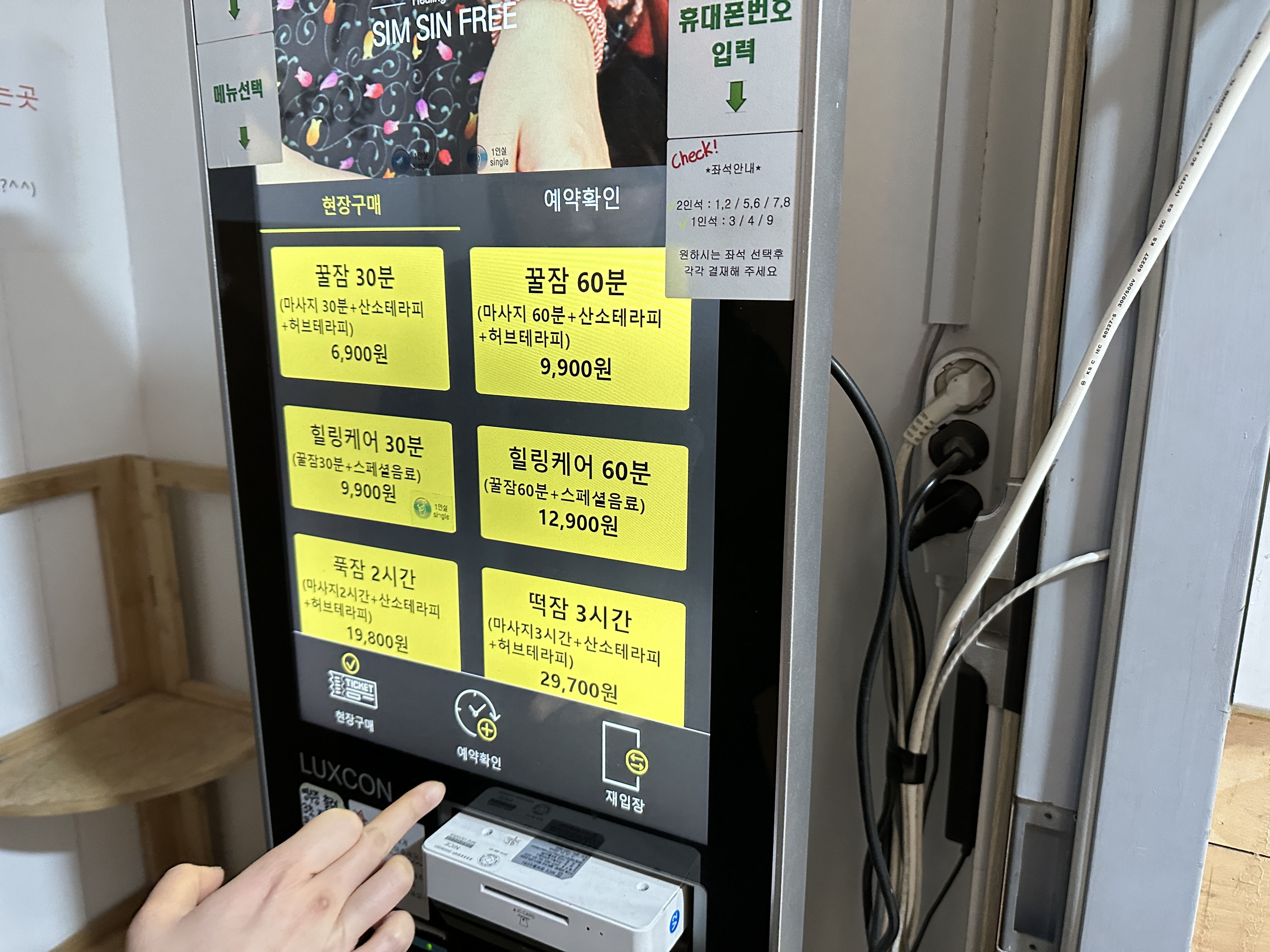 친구가 미리 인터넷으로 예약하고 온 상태였는데 현장에서 키오스크로 예약확인 하고 들어가야 하더라고요. 저희는 꿀잠 30분으로 예약했고요. 가격은 1인 6,900원입니다. 안마의자를 해볼 일이 잘 없는데 가끔씩 힐링카페 가면 좋더라고요. 예약시간보다 30분은 빨리 왔는데 입장 가능했어요!