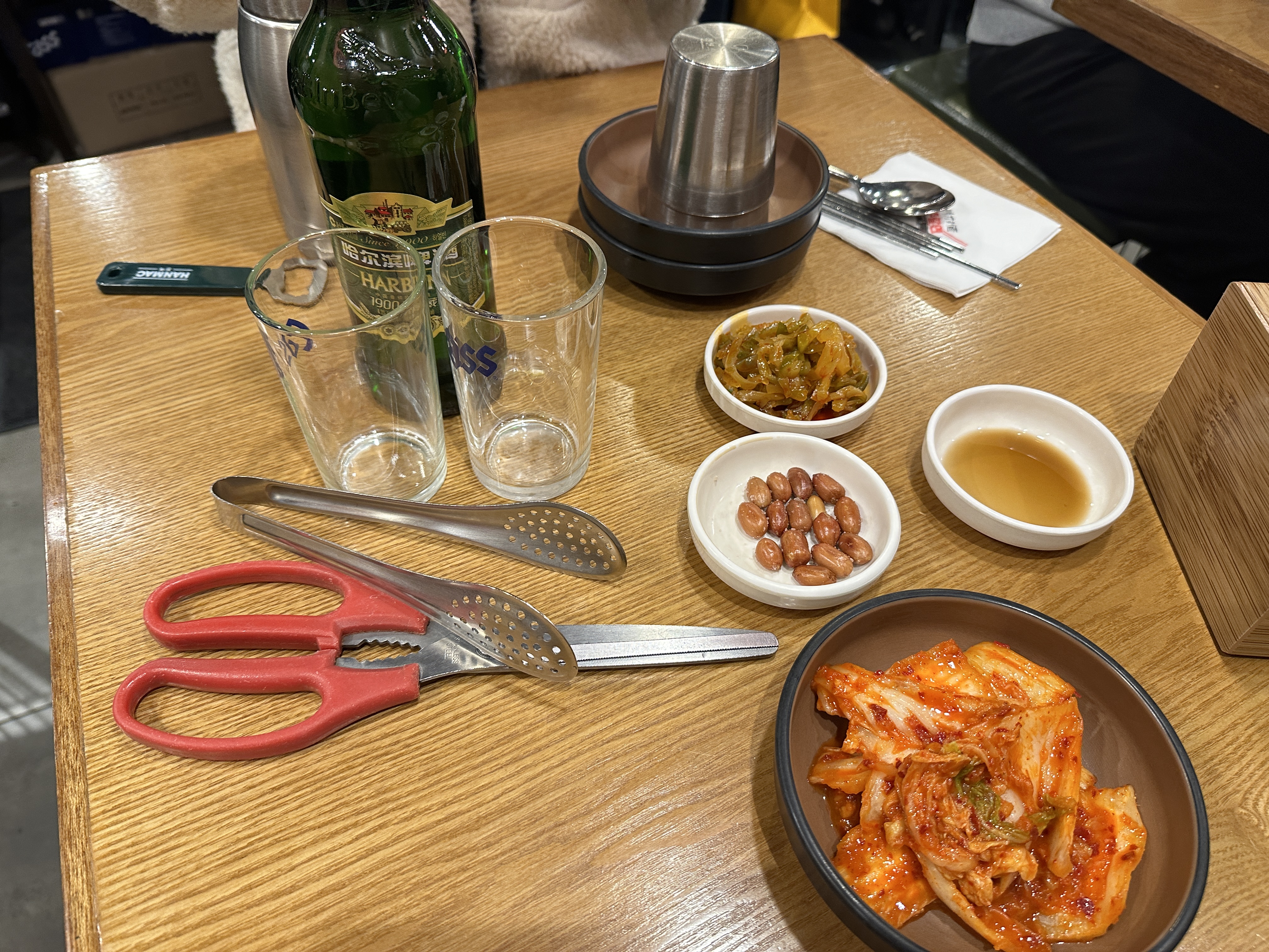 하얼빈 맥주도 시켰습니다. 중국은 맥주 미지근하게 먹는다고 들었는데 여긴 명동이라 그런지 다행히 시원했어요~ 땅콩이랑 김치 짜사이가 나왔는데요. 란주칼면 짜차이가 진짜 맛있어요. 다른 데서 먹었던 짜사이랑 차원이 달랐습니다. 음식 나오는데 시간이 좀 걸렸는데 짜사이 계속 집어먹다가 나중에 리필 요청하니까 없다고 하더라고요. 리필 안 해주려고 그러나 생각했는데 나중에 왔던 옆 테이블 보니 짜사이를 정말 안주더라고요.. 찐으로 없는 것이었음 ㅠㅠ