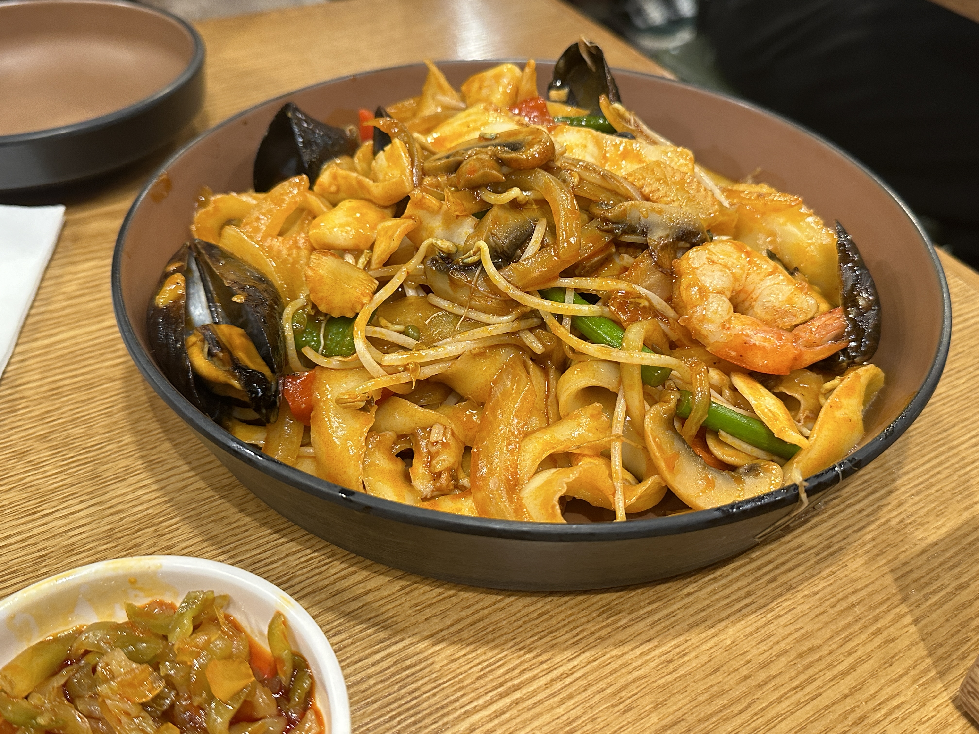 주문한 란주칼면의 해물볶음도삭면입니다. 이게 1인분이라는 거 믿어지시나요.. 해물도 꽤 많이 들었고 볶음면 양념도 맛있었어요. 무엇보다 중요한 건 도삭면이 미쳤습니다. 이렇게 통통한 도삭면 처음 봐요. 쫄깃쫄깃하고 두꺼워서 떡을 먹는 거 같았어요.