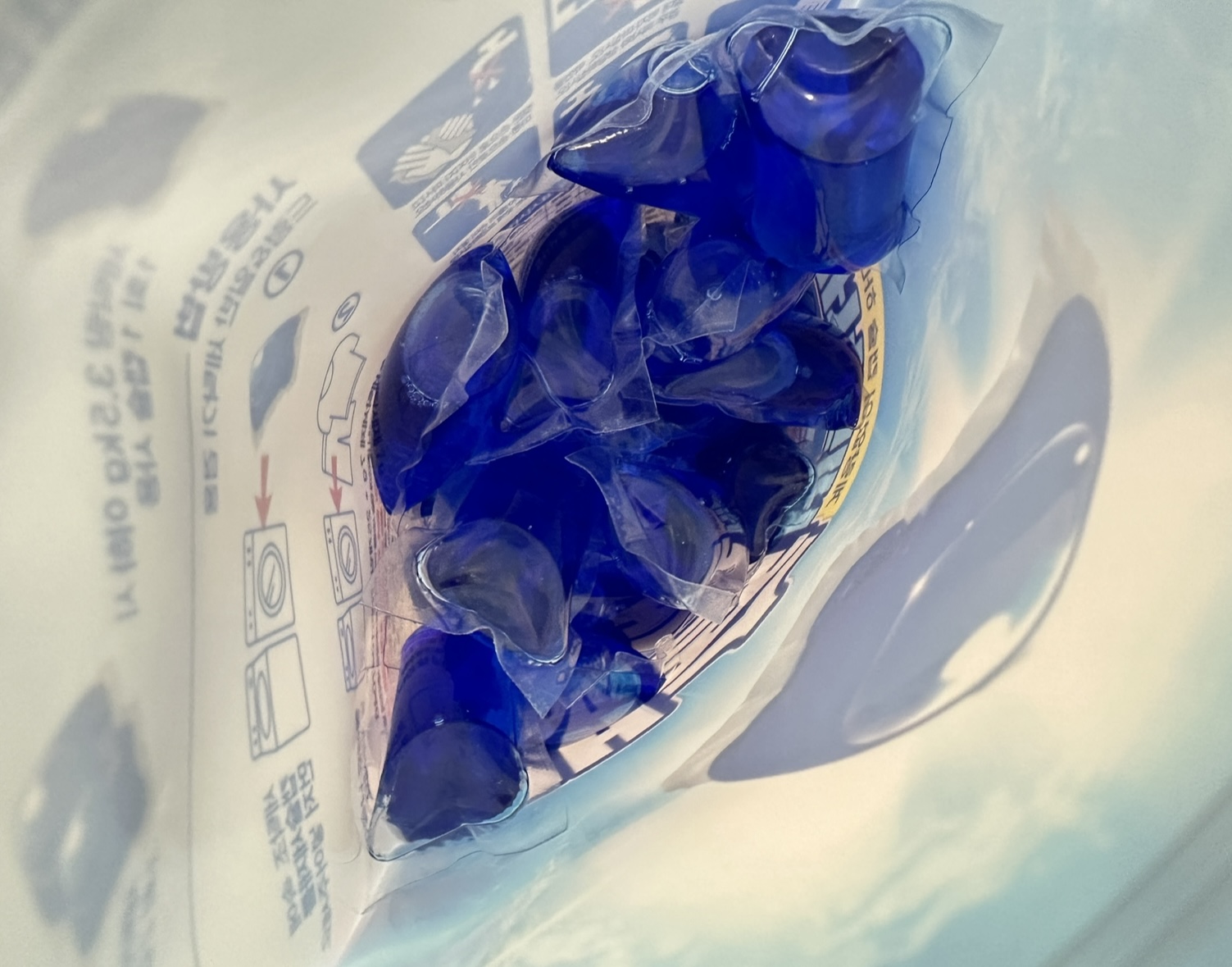포장지 열어보면 파란색 다이소 캡슐세제가 보여요~ 아니 이 세탁세제 지퍼팩이 엄청 견고해서 나중에 잘 안열리더라고요. 설명서를 보니 비틀어서 열면 잘 열린다고 합니다.