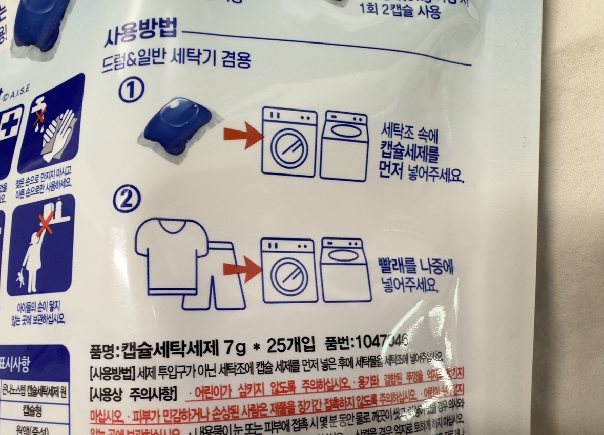 캡슐세제는 총 25개가 들어있고요. 사용방법을 보시면 세탁투입구가 아닌 세탁조에 캡슐세제를 먼저 넣고 빨래를 나중에 넣으라고 합니다. 이렇게 세제를 쓰는건 처음이라 신기해요.