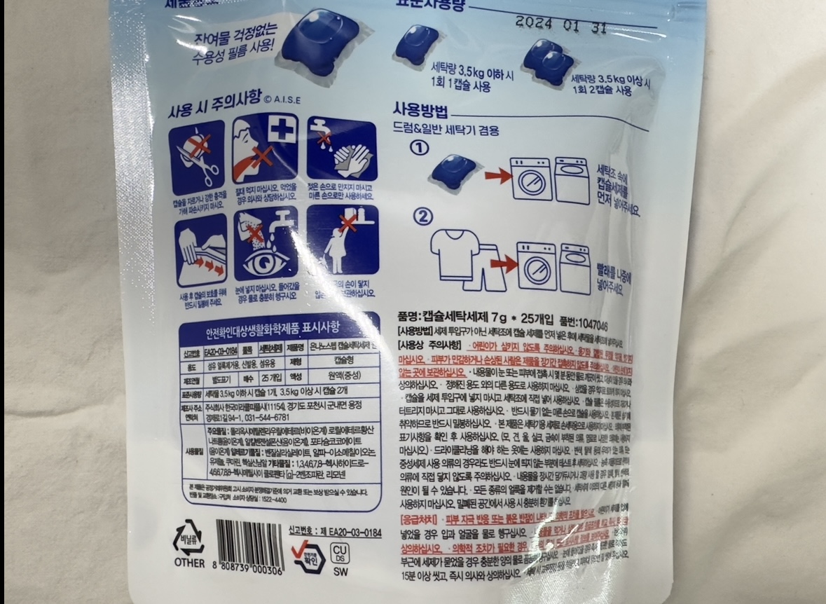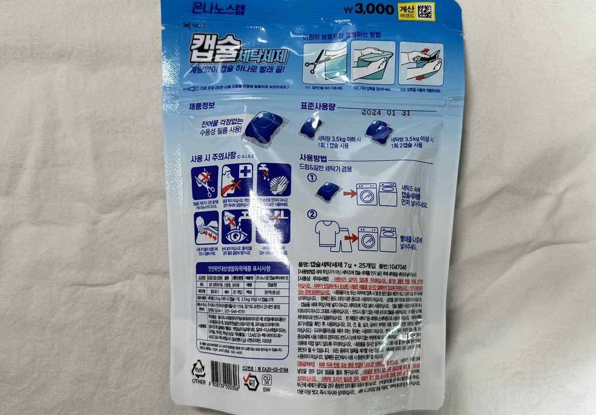 표준 사용량음 세탁량 3.5kg 이하 시는 1회 1캡슐, 3.5kg이상시 1회2캡슐 사용하면 됩니다. 좀 헤픈감은 있네요.