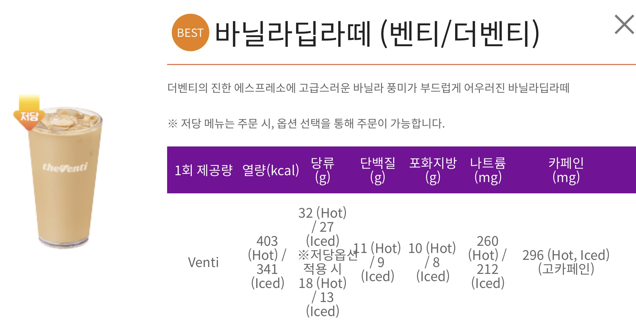 네, 저는 요즘 더벤티의 바닐라딥라떼에 빠졌습니다. 더벤티 아바라 맛있더라고요.. 아이스 바닐라 라떼 칼로리 높은 건 알지만 액상과당을 종종 찾게 되네요.. 흐흐 더벤티에 저당 옵션이 생긴