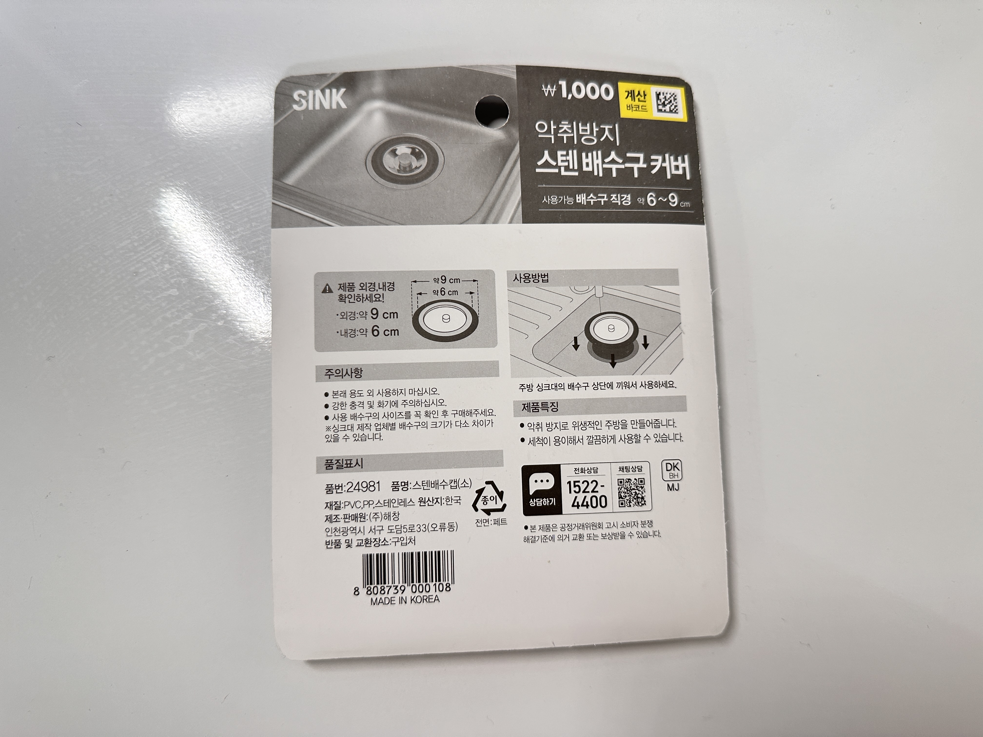 악취방지 스텐 배수구 커버 윗부분의 파란색 스티커를 제거해 주니 배수구 덮개가 더 번쩍거리네요.. 플라스틱 덮개들보다 훨씬 깔끔하고 위생적으로 보입니다.