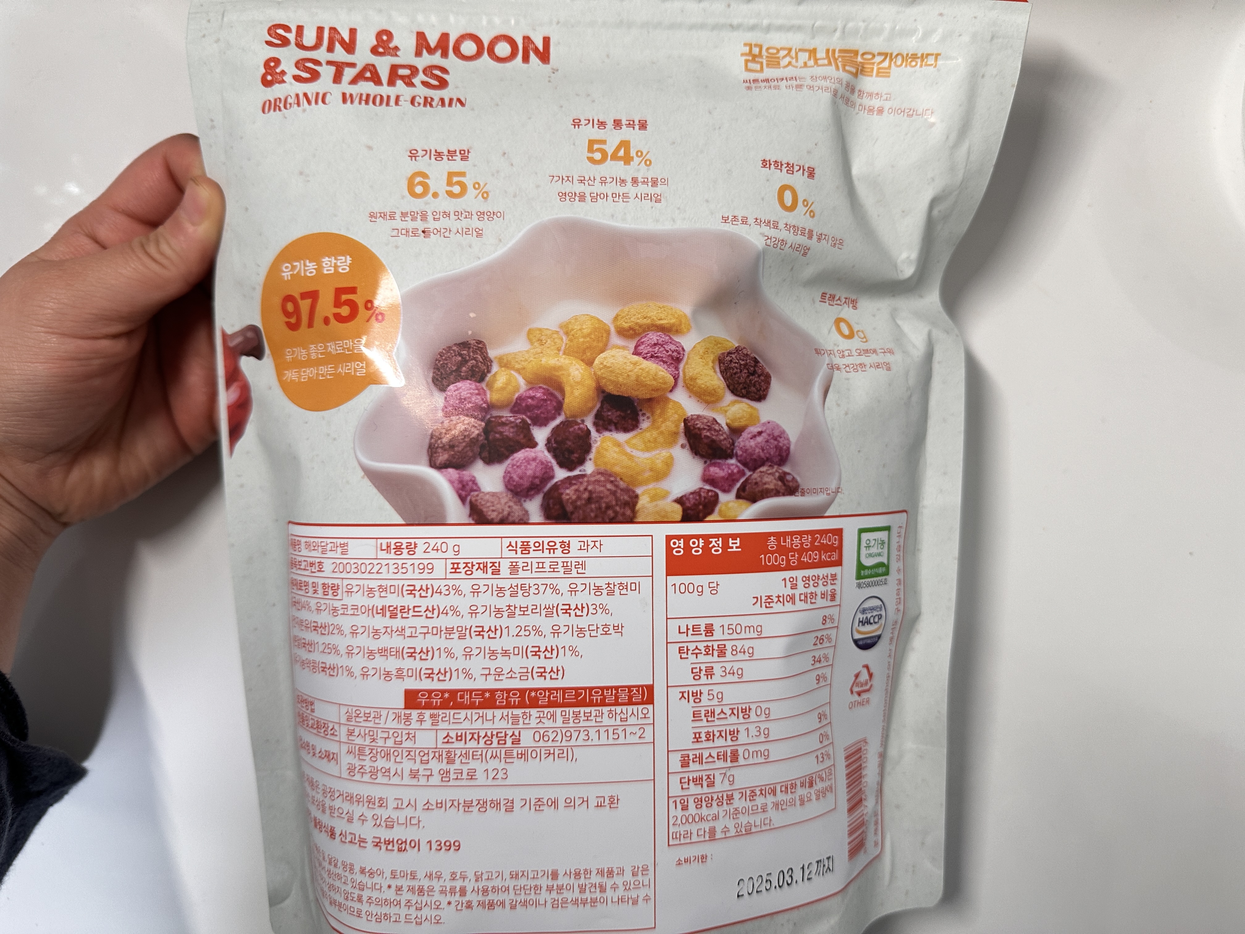 씨투베이커리 유기농 시리얼 종류는 초코볼, 채소 후레이크, 해달별 이렇게 세 가지 종류가 있고요. 저는 제일 귀엽게 생긴 해달별을 구매했어요. 유기농 함량이 무려 97.5%나 됩니다. 유기농 좋아~