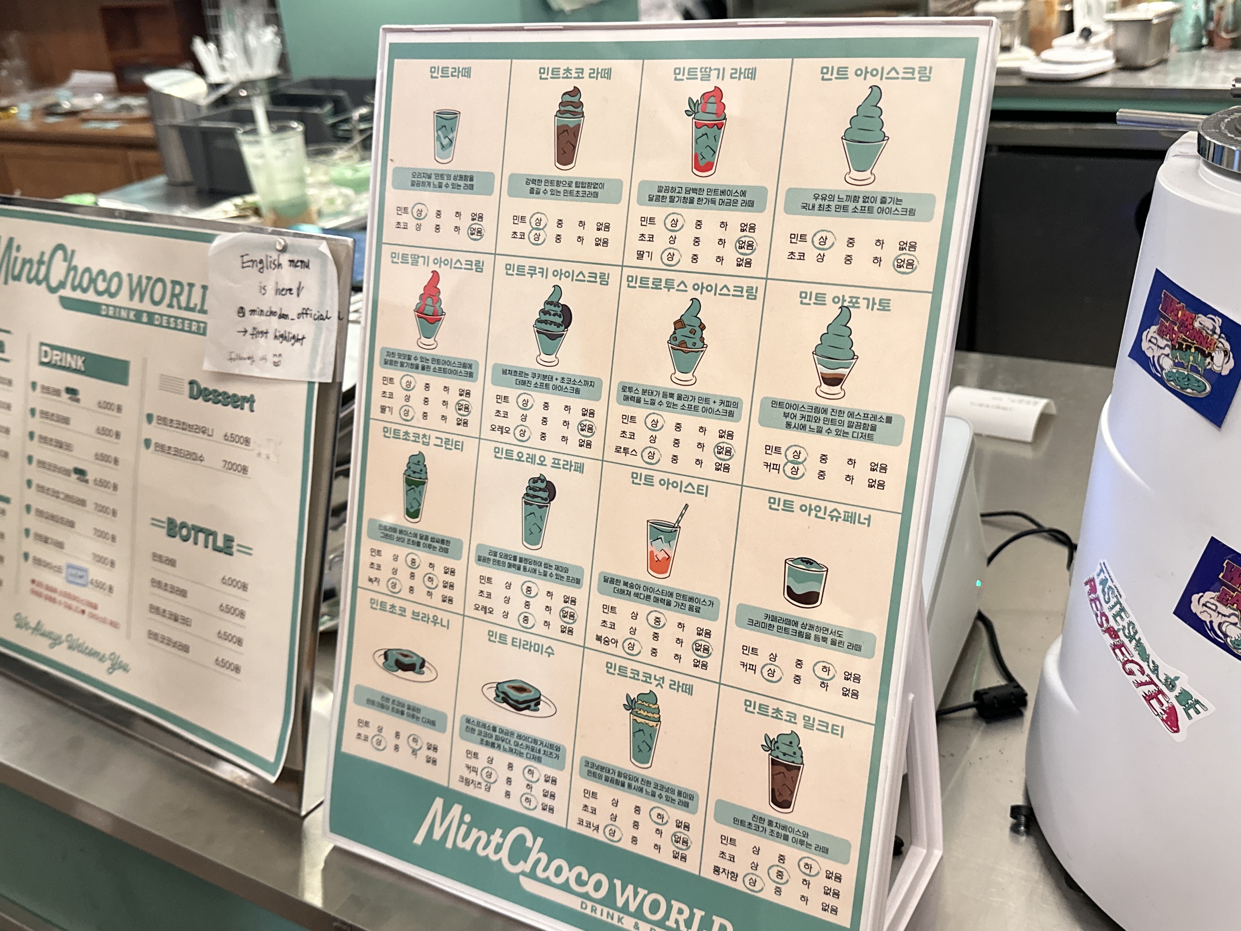 메뉴 옆에 보시면 민트 강도도 나와있어요! 저희가 시킨 민트딸기 라떼와 민트라떼에는 초코가 안 들어간다고 사장님이 미리 말씀해 주셨어요. 민트 초코를 원하시면 초코가 들어있는 음료를 시키면 될 거 같아요.