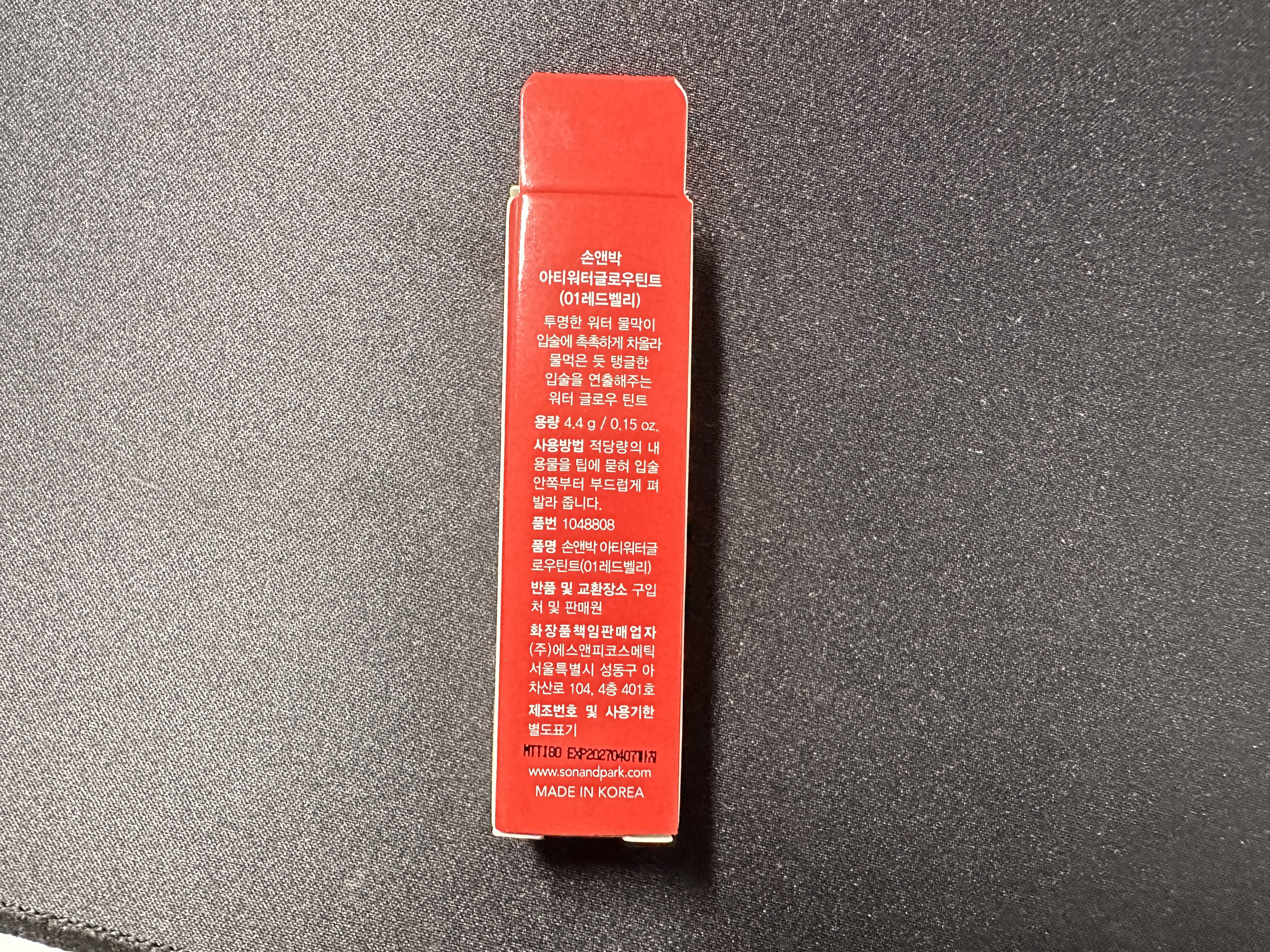 손앤박 아티워터글로우틴트 레드벨리색상 구매! 물먹은 듯 탱글한 입술을 연출해 주는 워터 글로우 틴트라고 합니다. 품번은 1048808번이에요. 국내생산 제품이고요~