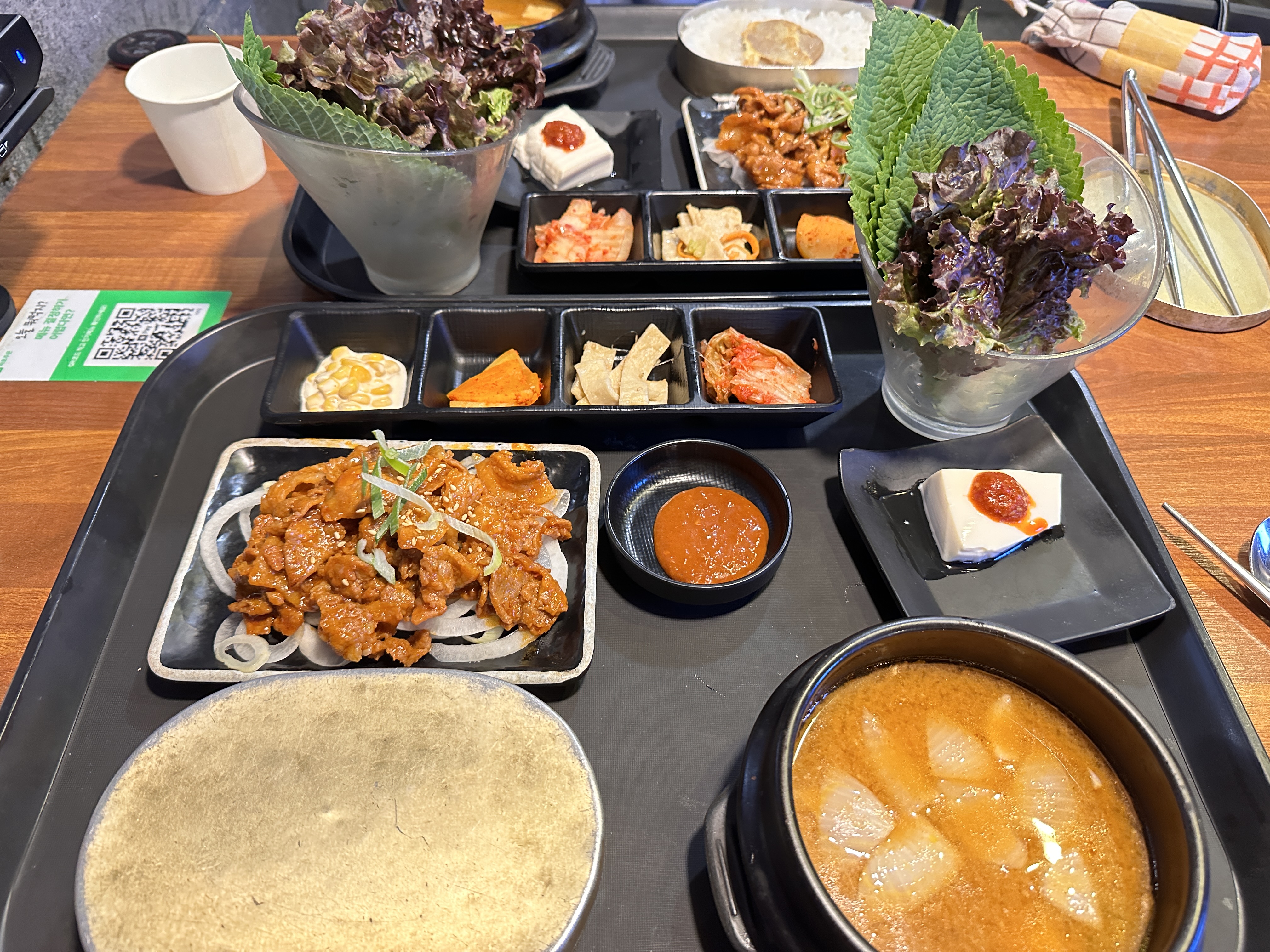 조금 기다리니 음식이 바로 나왔습니다. 푸드코트처럼 쟁반에 정식 메뉴들이 나오고요. 국도 뚝배기에 나오고 반찬도 꽤 다양하게 나옵니다. 밥은 옛날 도시락에 담겨져있어요.