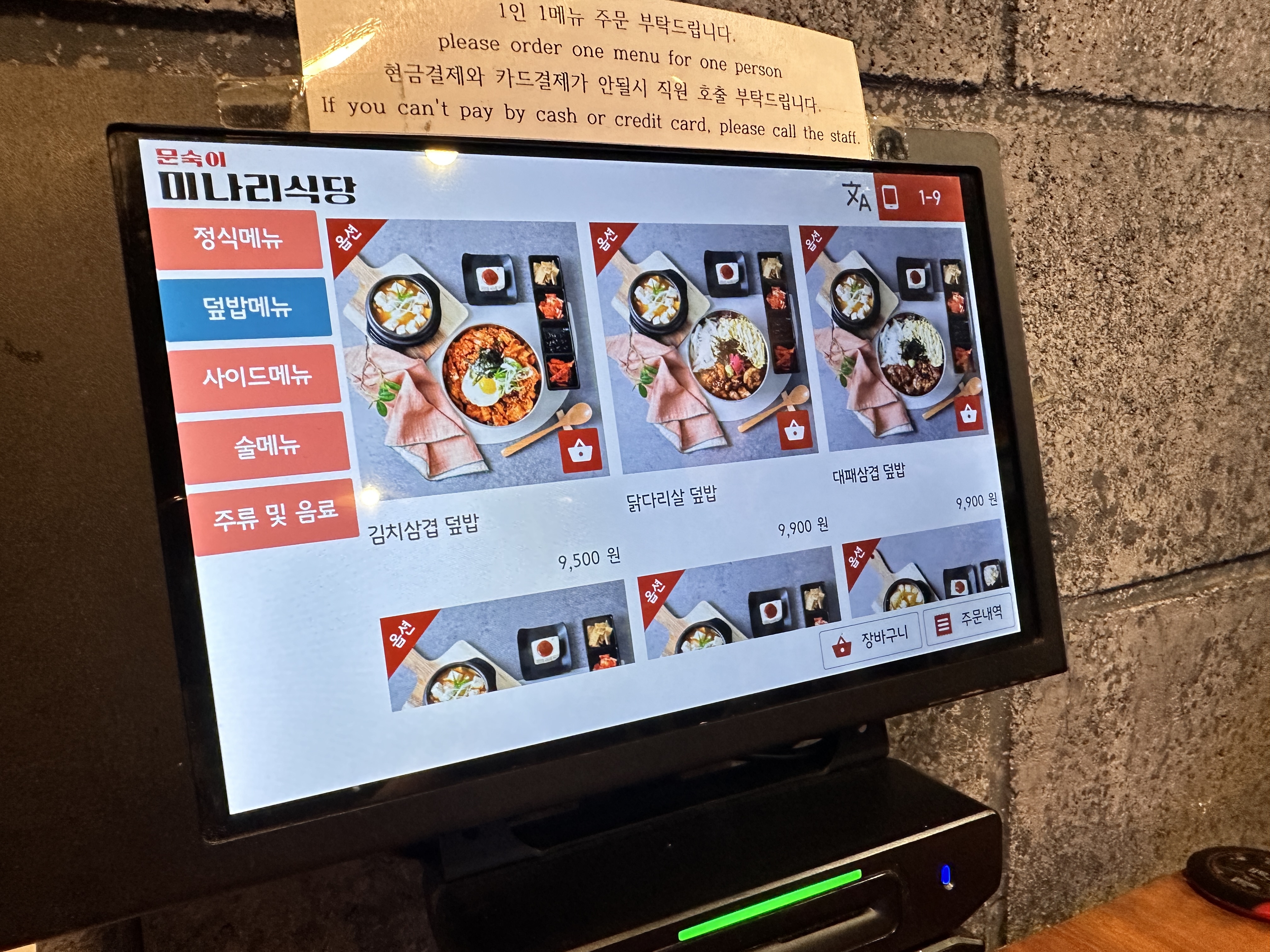 홍대 밥집으로 추천하고 싶은 문숙이 미나리식당 메뉴의 덮밥메뉴입니다. 덮밥류는 더 저렴하네요. 메뉴는 이렇게만 찍어봤고요~ 자리에서 테이블 키오스크로 주문 결제까지 하면 주문 완료입니다!