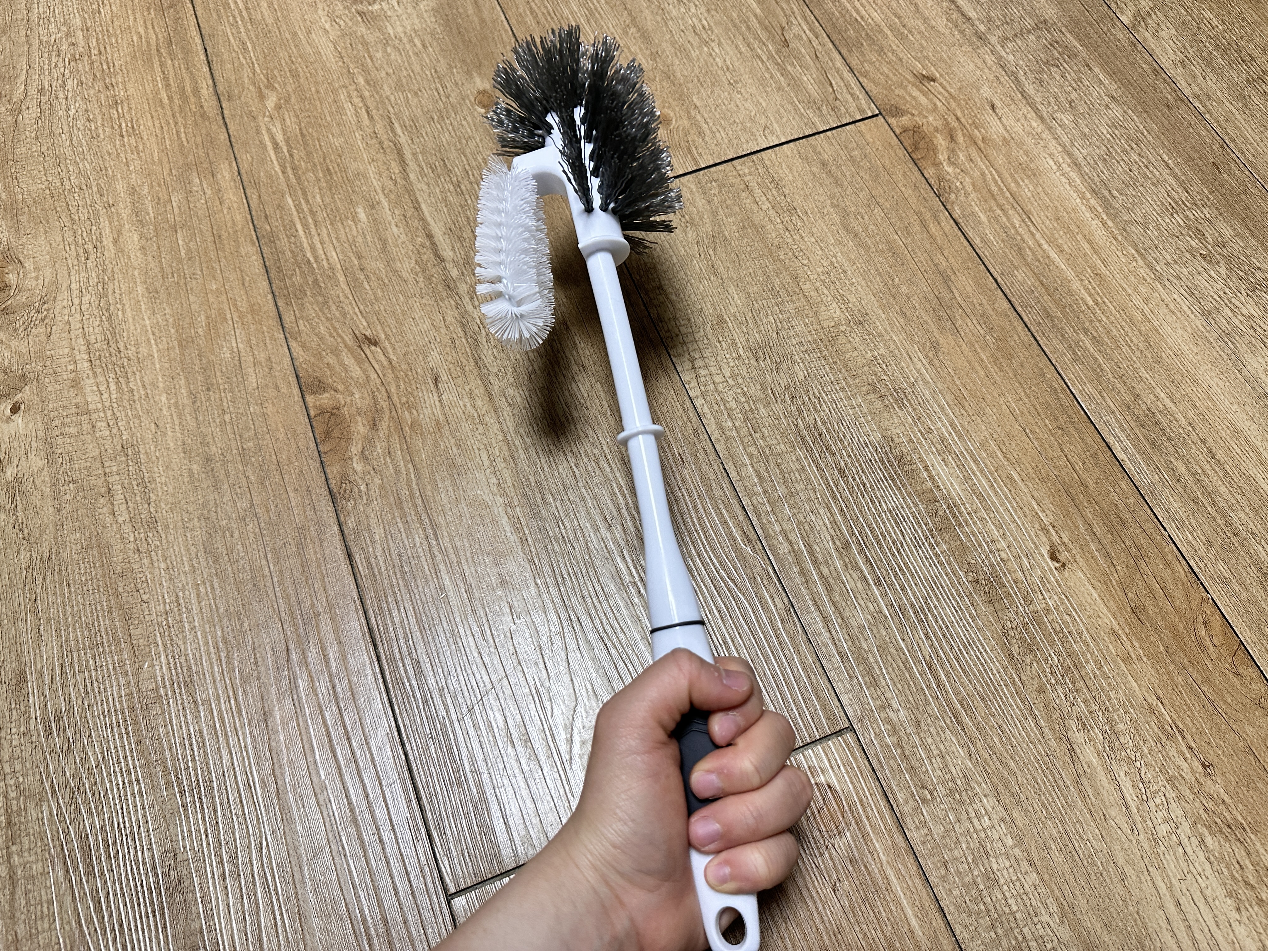크기비교를 위해 손에 쥐고도 한번 찍어봤습니다. 작은 미니솔에 비하면 좀 더 긴 편인 거 같아요. 청소하는 사진은 좀 비위 상하니까 찍진 않았습니다ㅎㅎ 사용후기는요. 이거 정말 괜찮은데요?? 변기 청소는 물론 잘 됐고요.