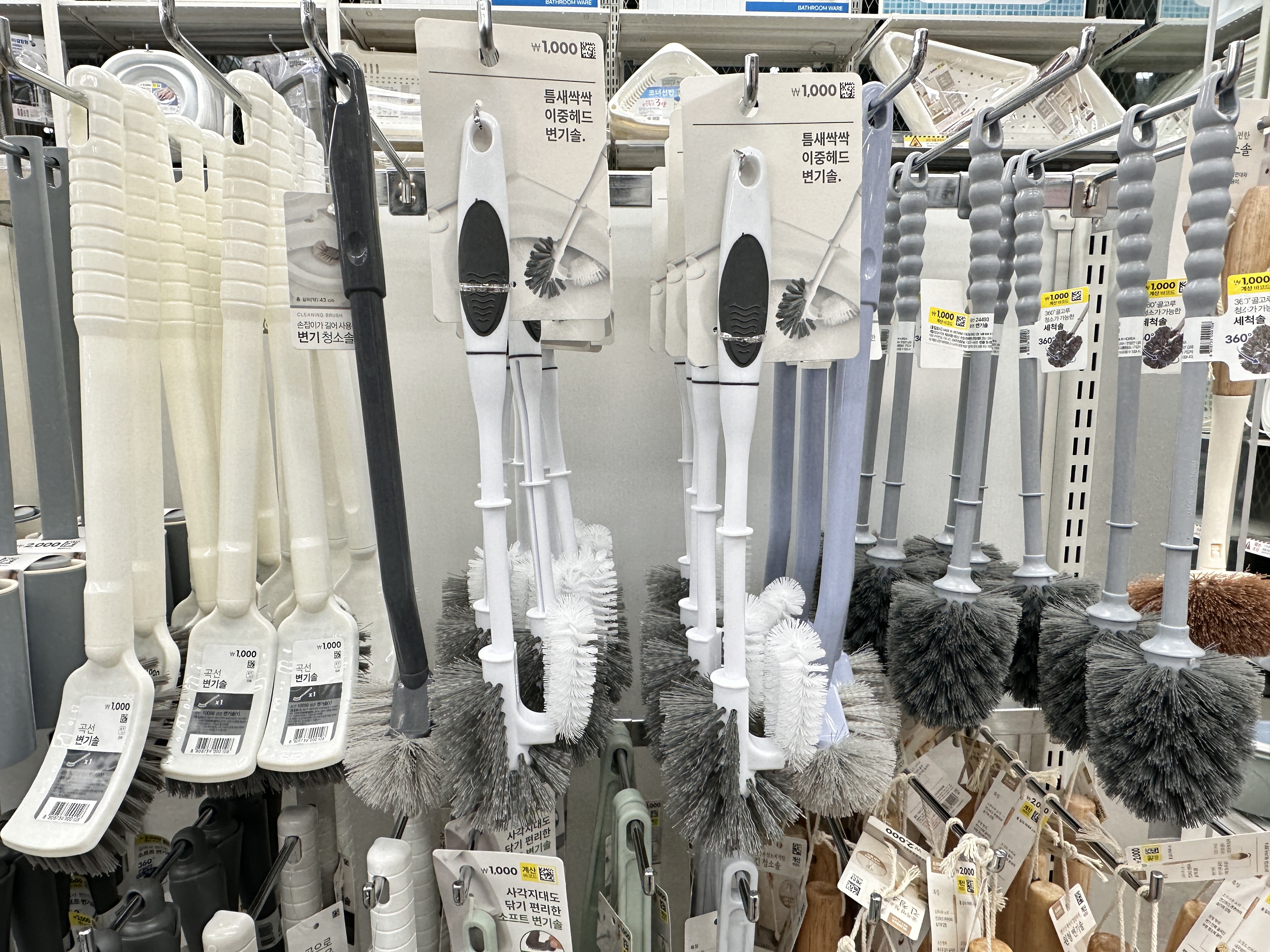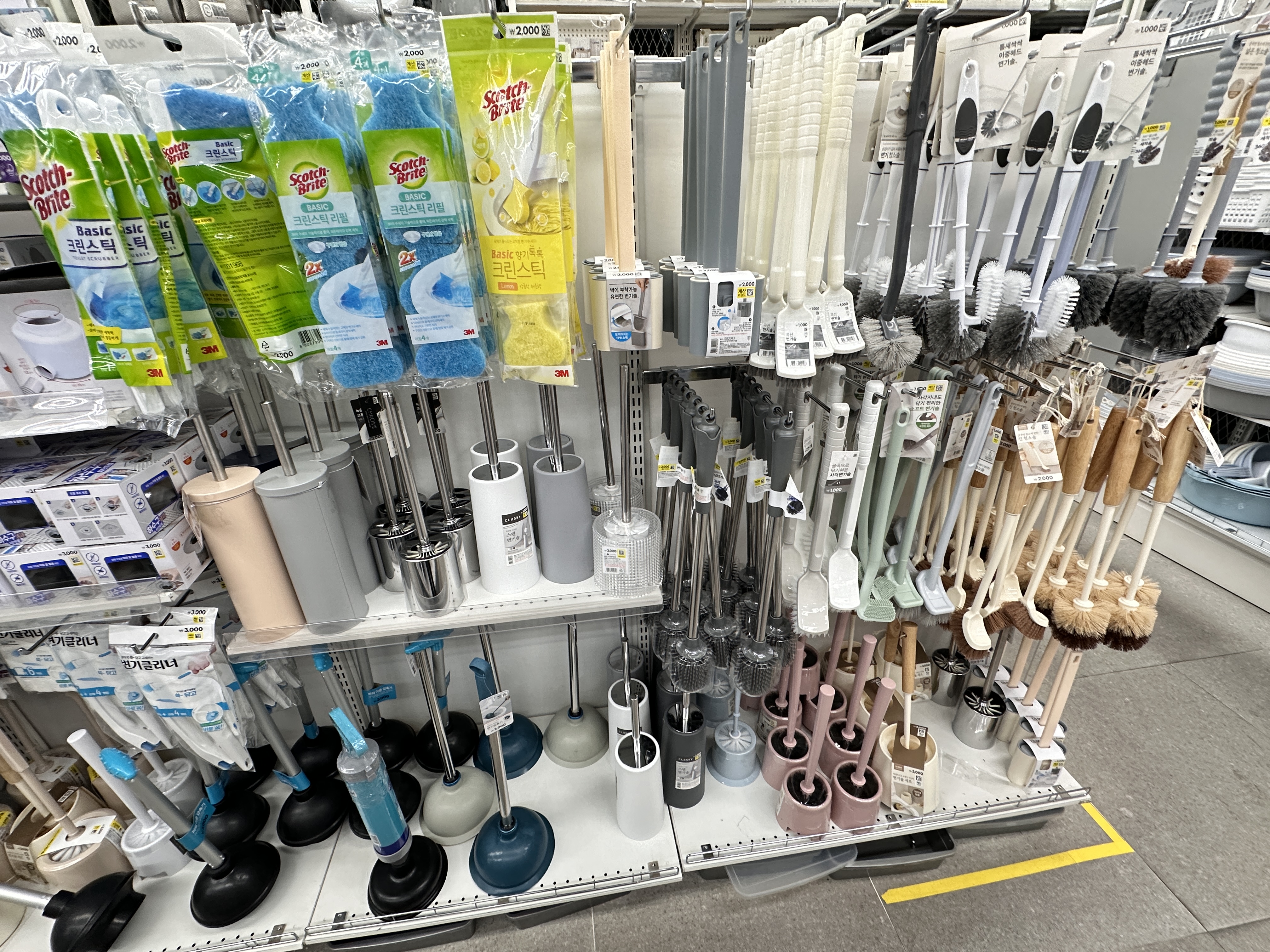 다이소 변기 솔부터 구경하세요. 예전엔 이케아 변기솔이 싼줄 알고 이케아에서 구매했었는데 다이소가 훨씬 싸더라고요. 변기솔 옆에는 뚫어뻥도 다양한 형태로 판매하고 있습니다. 진짜 갓이소..