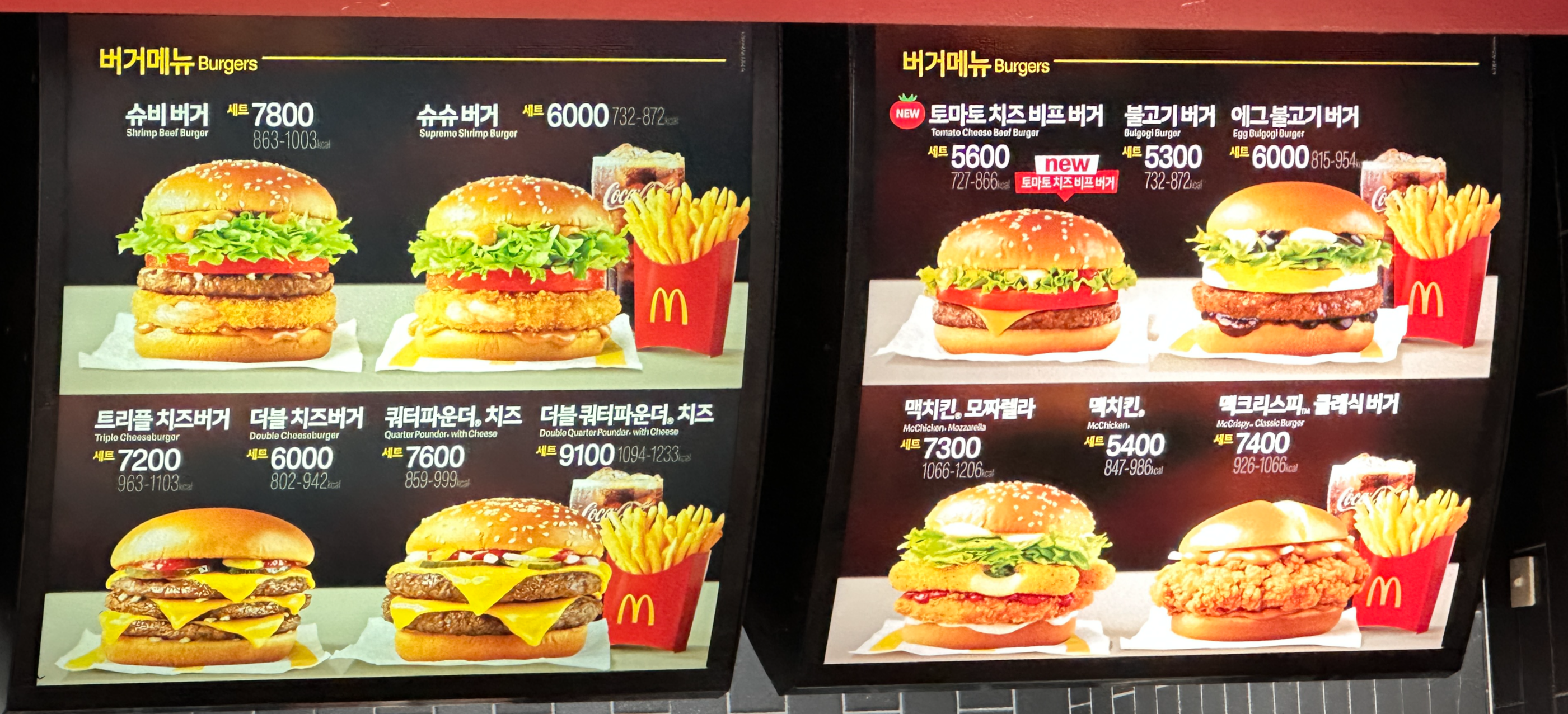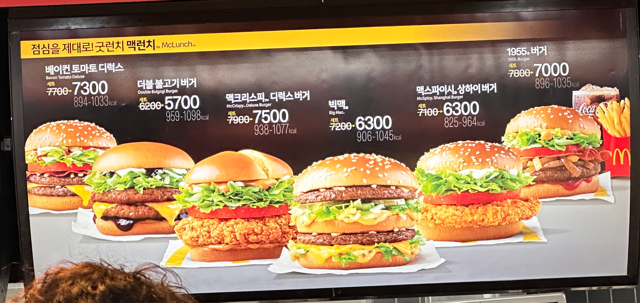 베이컨 토마토 디럭스, 더블 불고기버거, 맥크리스피 디럭스 버거, 빅맥, 맥스파이시 상하이버거, 1955버거입니다.