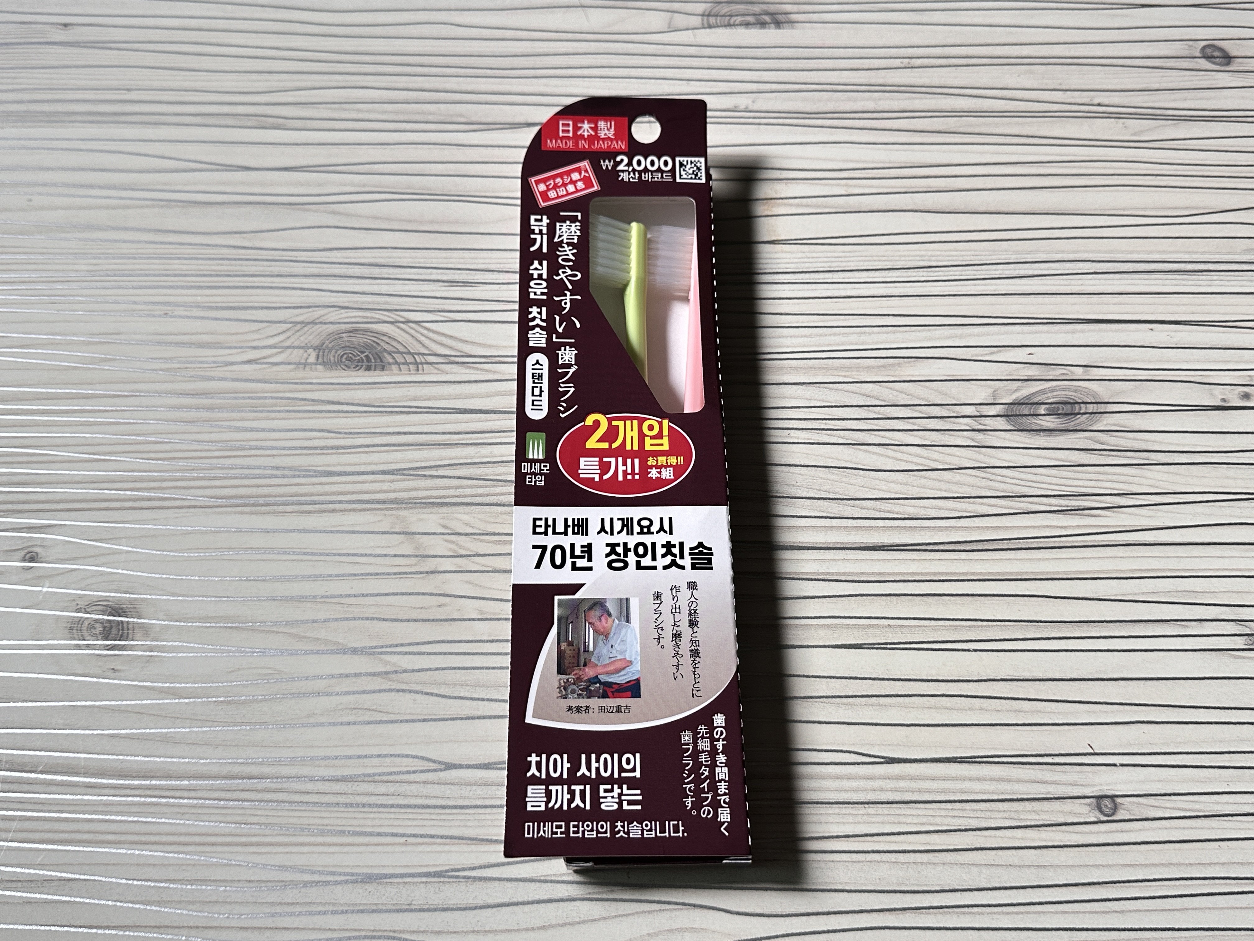 타나베 시게요시 70년 장인칫솔이라는 제품입니다. 가격은 2,000원에 구매했고 2개가 들어있어서 개당 천꼴이었어요.