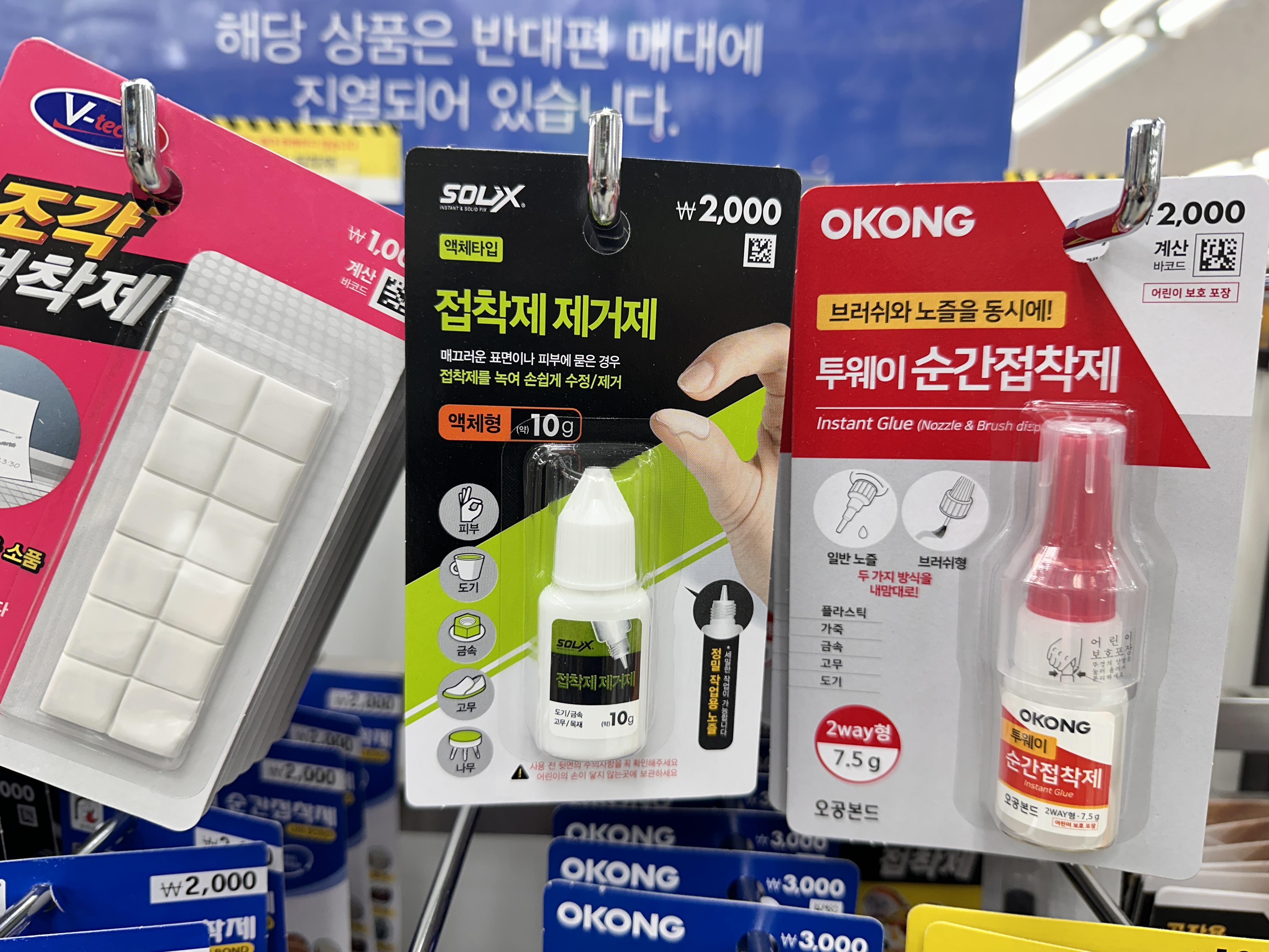 그 외에 다이소 접착제 제거제도 있으니 참고하세요! 접착제 피부에 묻으면 오래가는데 궁금하긴 하네요. 한번도 안써봤어요. 조각 접착제도 구매한 적 있는데 은근 요긴하게 쓰였습니다.