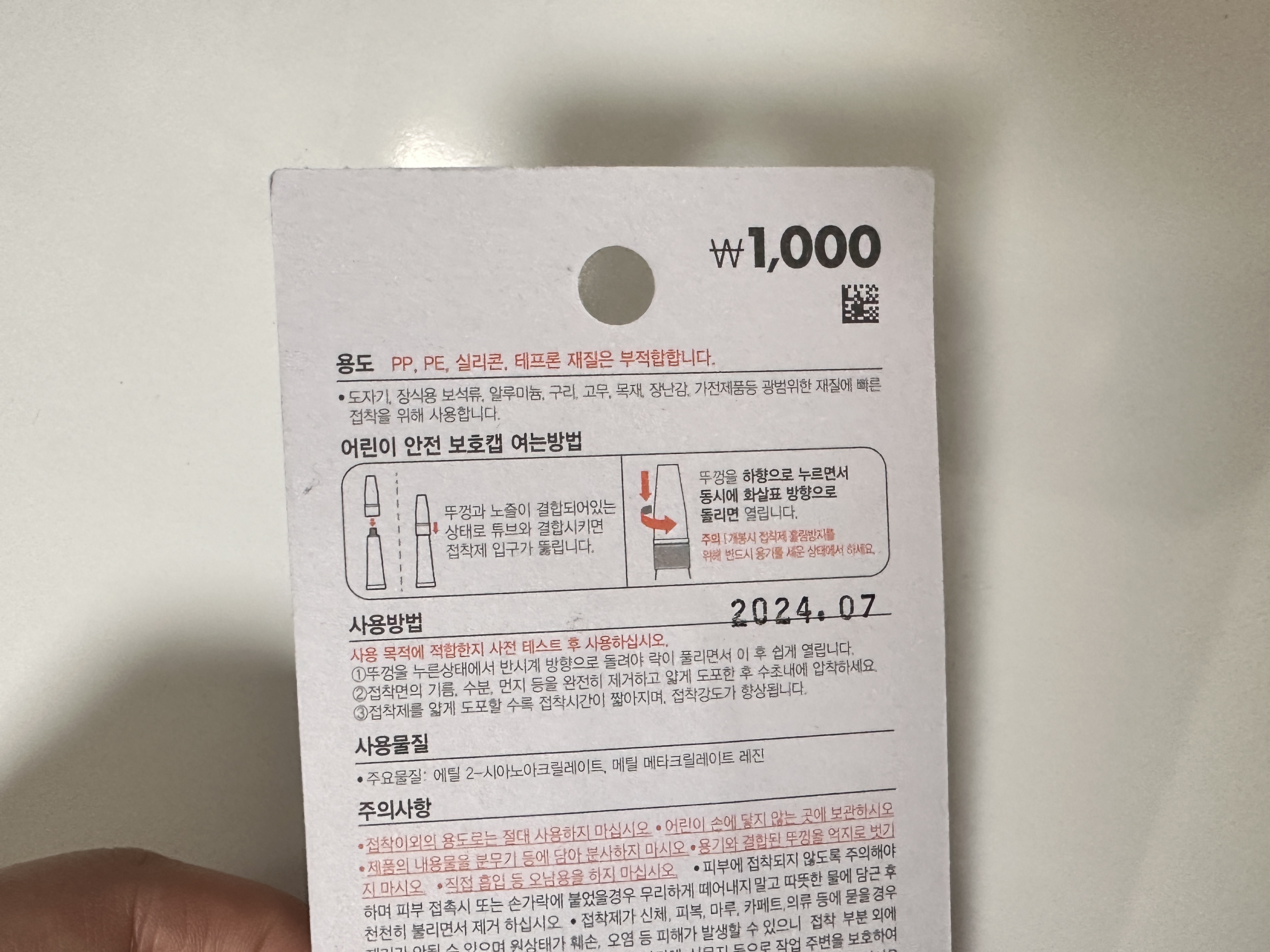 다이소 순간접착제 뒷면 사용방법도 확인하세요. 뚜껑을 돌려서 닫으면 막혀있던 접착제 입구가 뚫립니다. 한국에서 만든 제품이고요.. 19세 미만 판매 금지 제품이라 다이소에서 결제할 때 신분증을 보여줬었나 기억은 잘 안 나는데 직원 확인 후에 결제가 됐습니다.