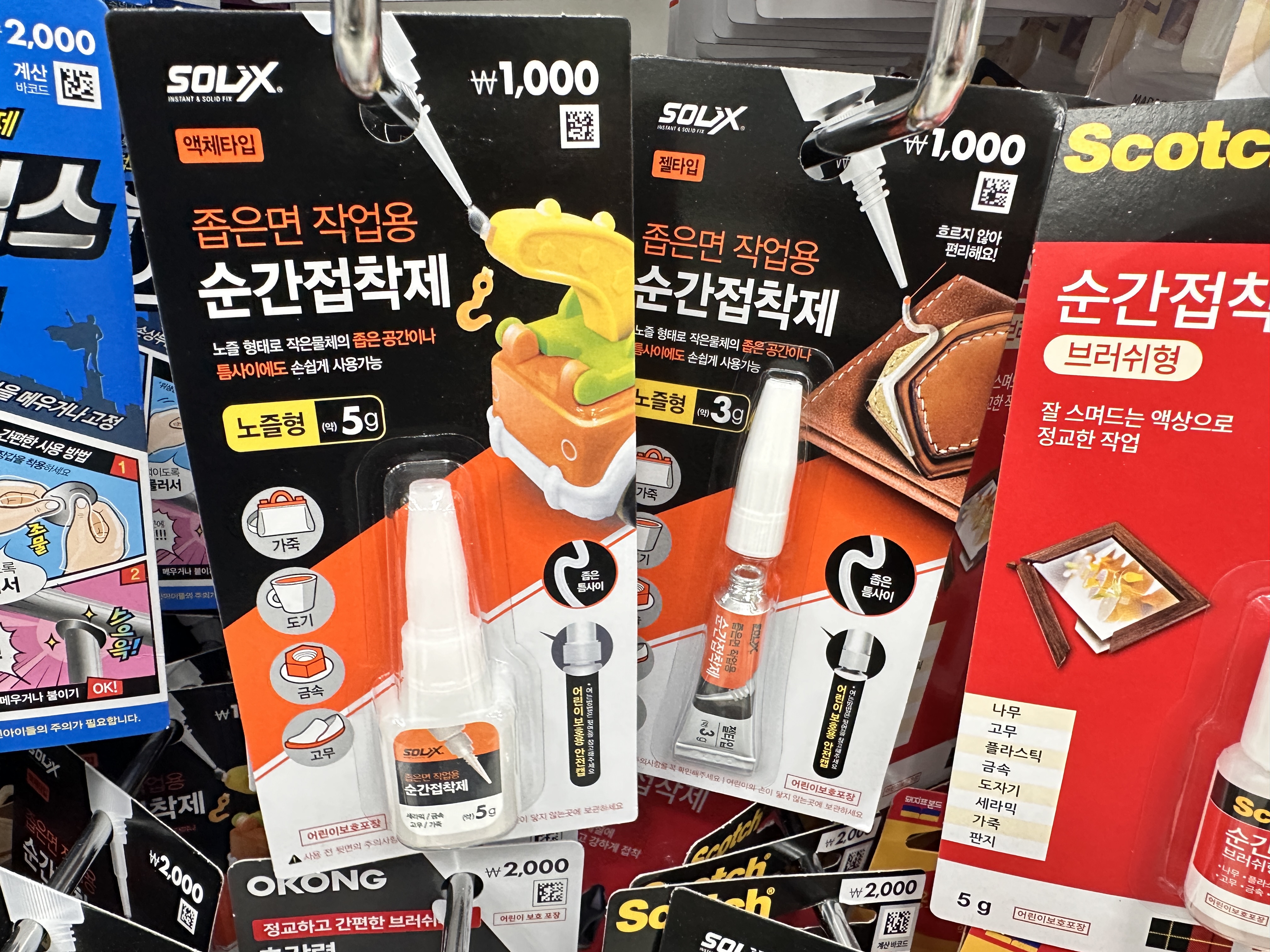다이소 접착제 종류들도 한번 찍어봤어요. 솔릭스 픽스는 지난번에 사보려다가 용도를 잘 모르겠어서 반품했던 기억이 있어요.