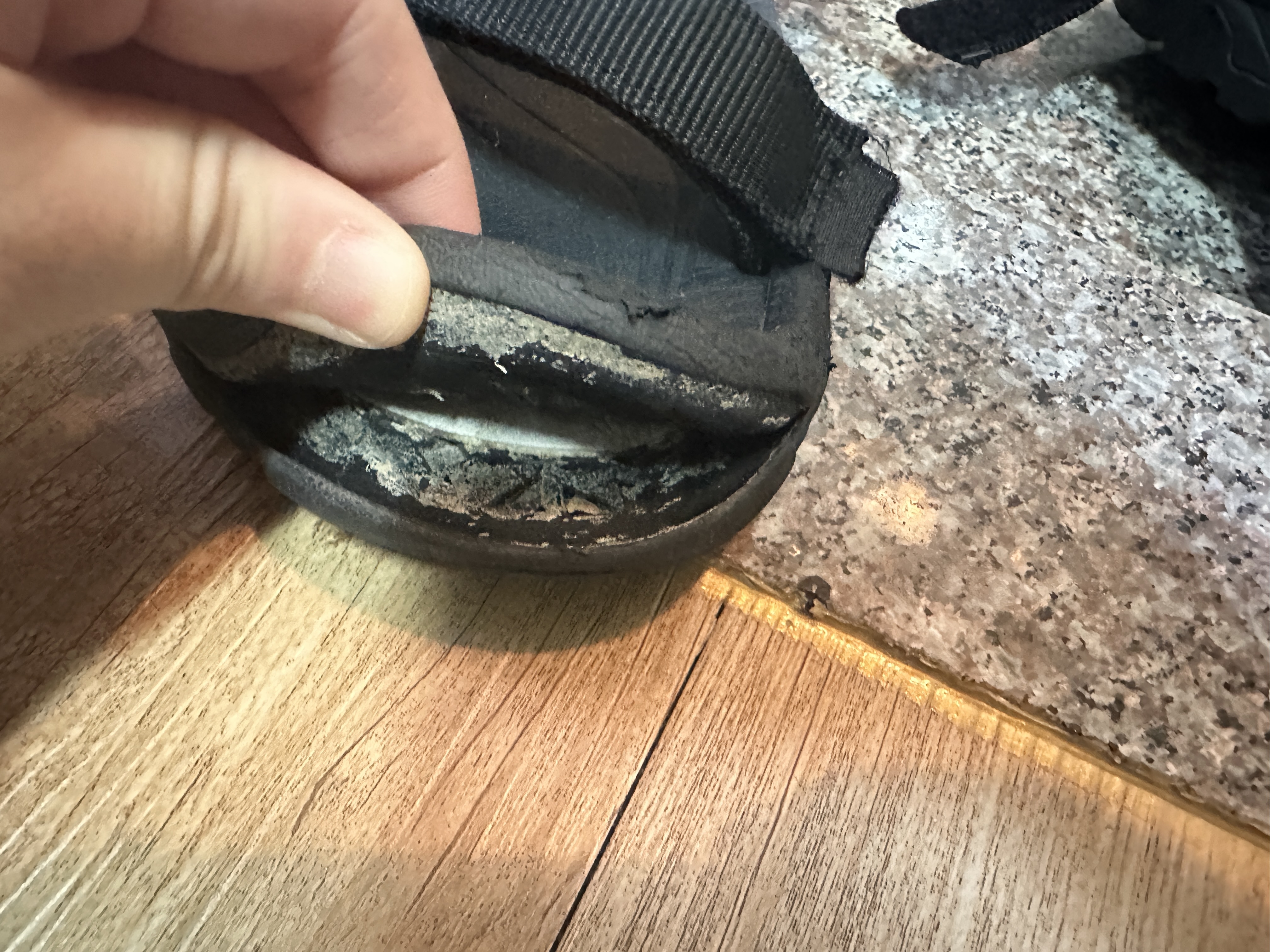 샌달 새거 사기도 귀찮고 여기까지 신다 보니 테바 샌들의 내구성이 어디까지인지 궁금해졌어요. 덜렁거리는 밑창을 다이소 순간접착제로 붙여보겠습니다.