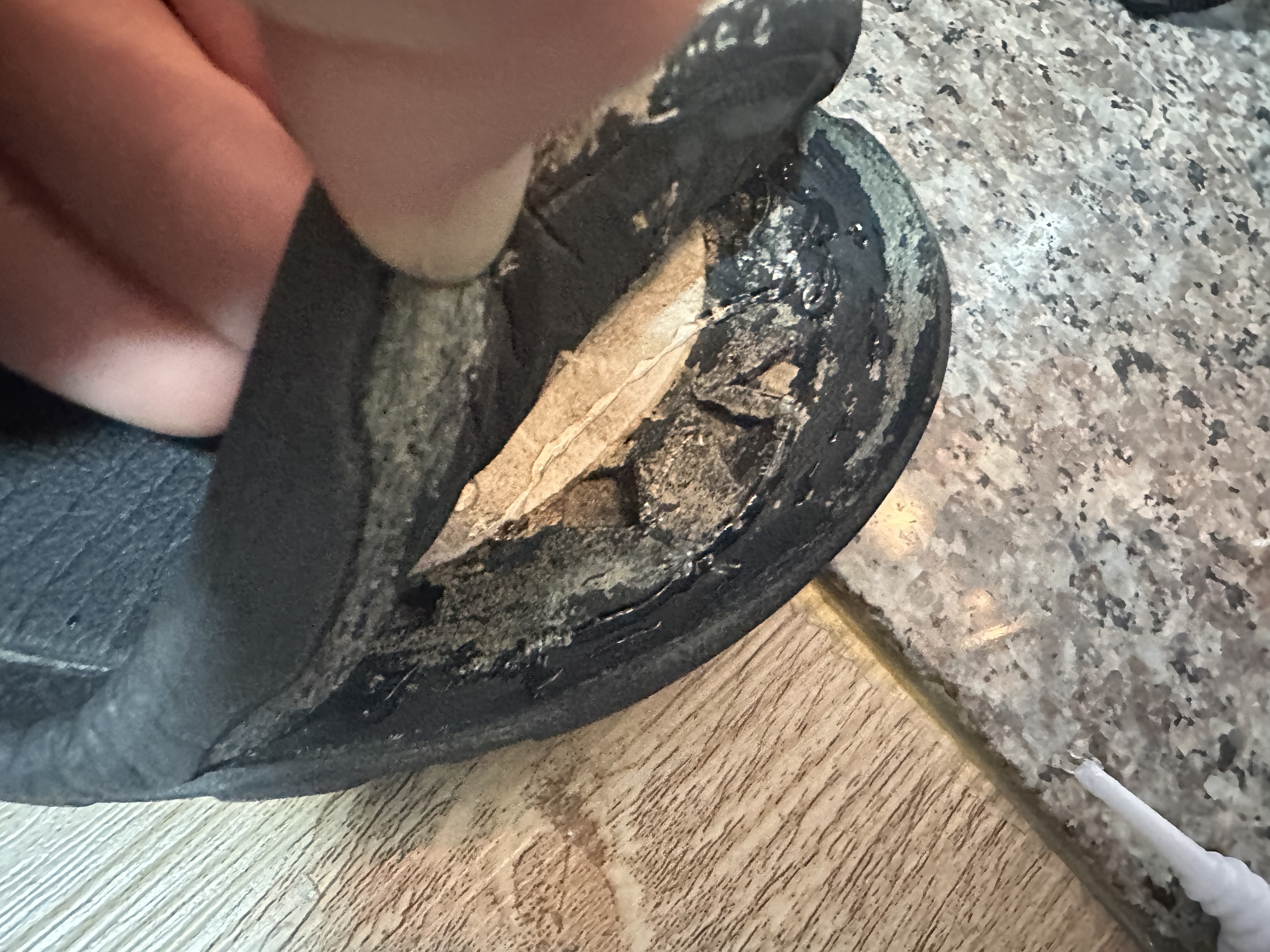 젤타입 순간접착제를 대충 둘둘 발라줬습니다. 인터넷에 찾아보니 순간접착제 바르고 바로 신지 말고 2-30분정도 접착제가 붙게 두더라고요. 저는 무거운 걸 올려두면 더 접착이 잘 되지 않을까 생각해서 집에서 놀고 있는 아령으로 샌들을 눌러줬습니다.