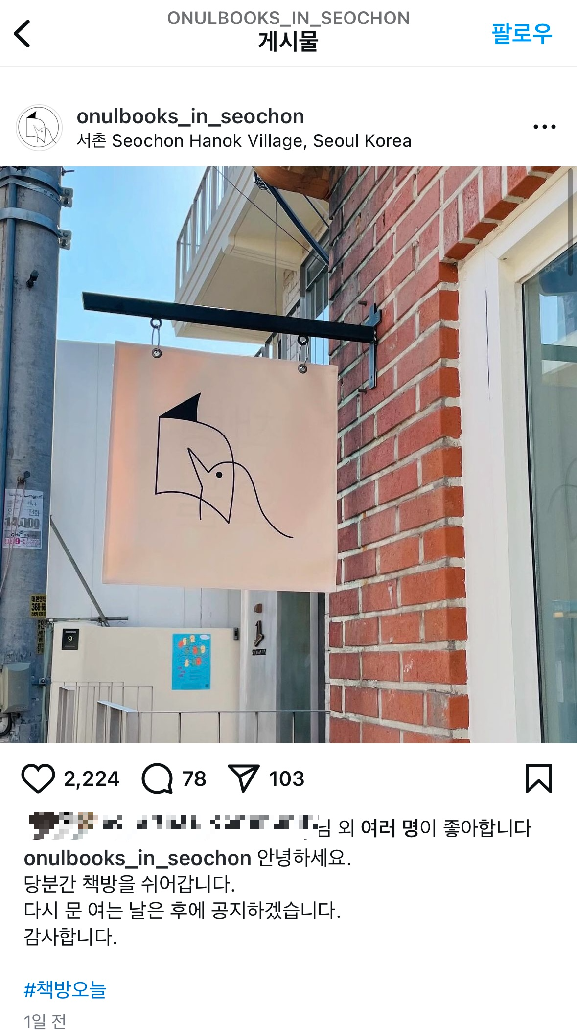궁금해서 책방오늘의 인스타그램을 찾아봤는데 책방오늘은 당분간 쉬어간다고 하네요. 노벨문학상 한강작가님의 서점인책방오늘 문 여는 날은 인스타그램으로 확인하면 될 거 같습니다. 책방 오픈할 때 서촌 한번 더 와봐야겠어요~