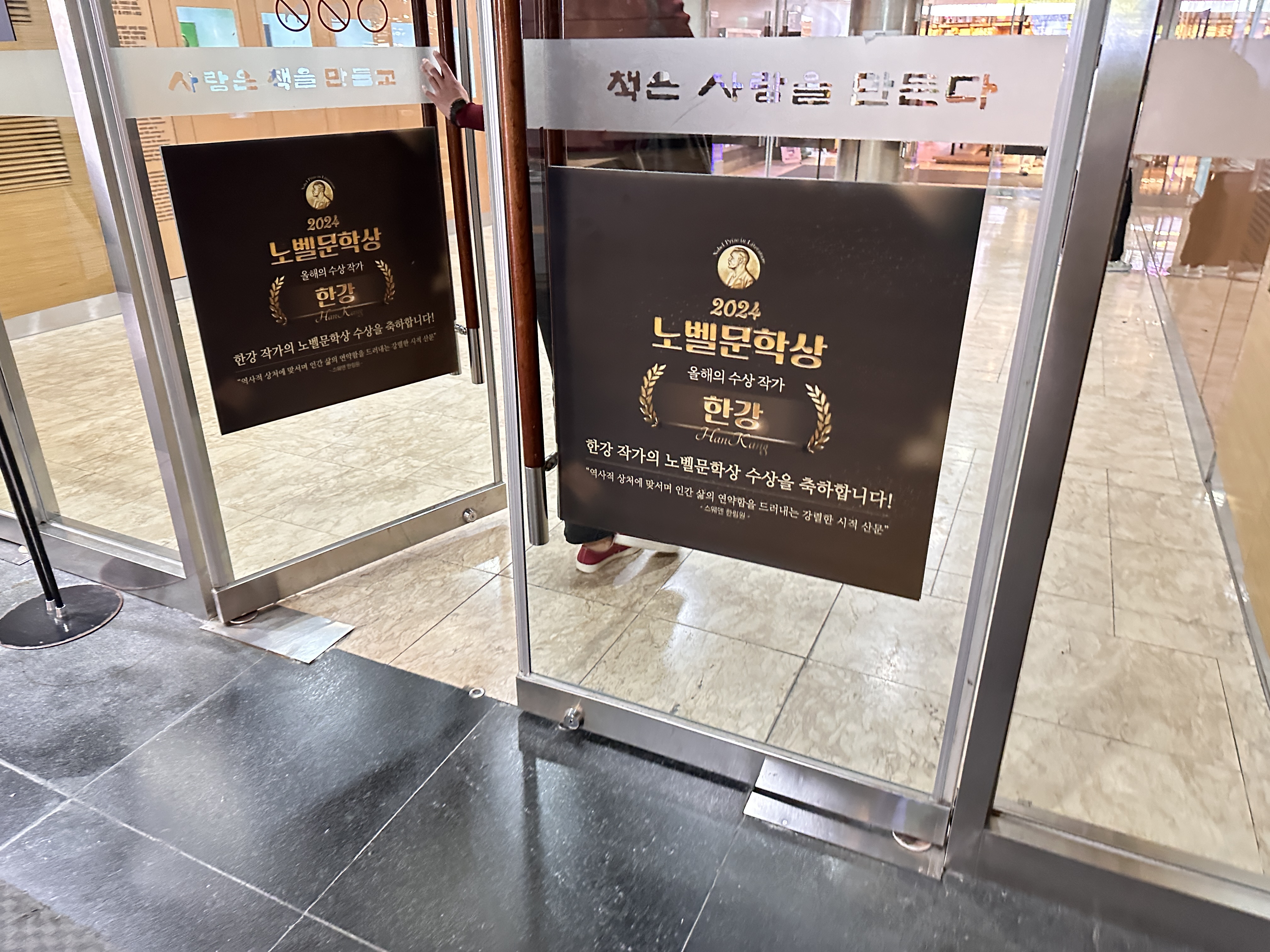 광화문 교보문고 문에 노벨문학상 수상을 축하하는 문구도 보였습니다. 광화문 교보문고 아주 오랜만에 방문했는데 한강 작가님 덕분인지 사람이 정말 많더라고요. 한강 작가님 책을 찾아보았는데 보이지 않는 걸로 보아 다 판매된 거 같았어요. 인터넷에서 서점 오픈런해서 한강 작가님 책을 산다는 걸 봤었는데 역시..