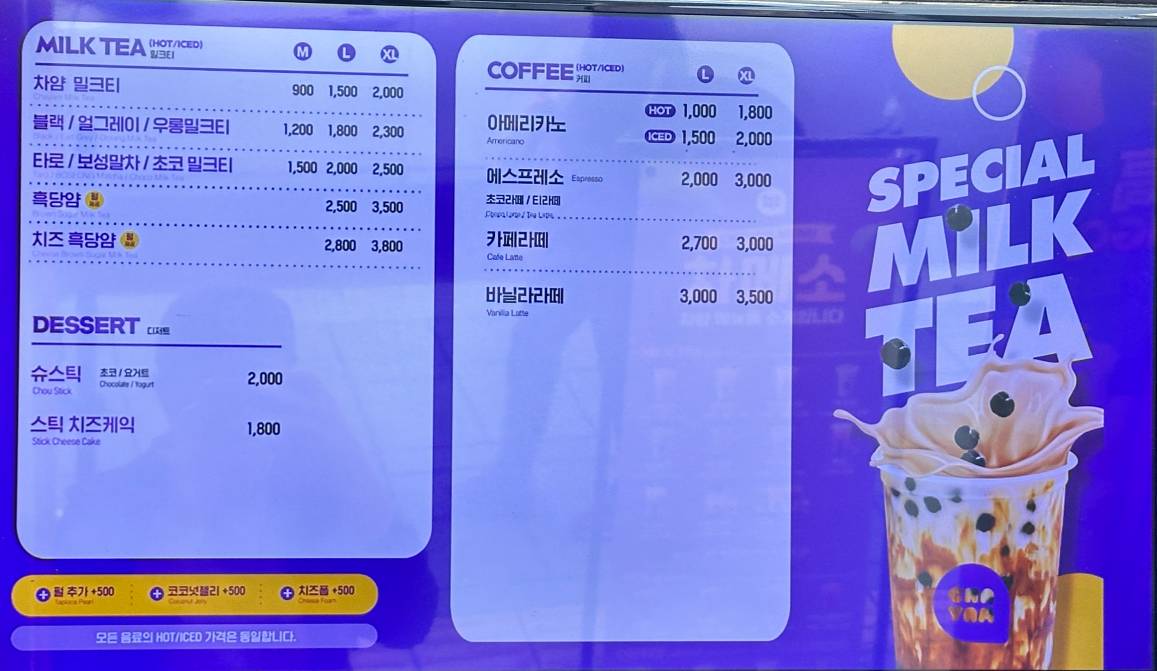 다음은 차얌 메뉴와 가격입니다. 차얌 밀크티 가격은 M사이즈가 900원이라니 정말 저렴합니다. 블랙/얼그레이/우롱밀크티 등이 M사이즈 1,200원이고요. 타로, 보성말차, 초코 밀크티 등이 1,500원입니다. 흑당얌과 치즈 흑당얌도 있어요. 차얌 커피 메뉴도 참고하세요! 차얌은 아메리카노도 천원으로 너무 저렴하네요. 그리고 차얌은 펄을 따로 추가해야 합니다. 펄추가 금액은 500원이에요. 펄 따로 추가해도 요즘 물가 생각하면 차얌 가격 가성비가 너무 좋습니다..