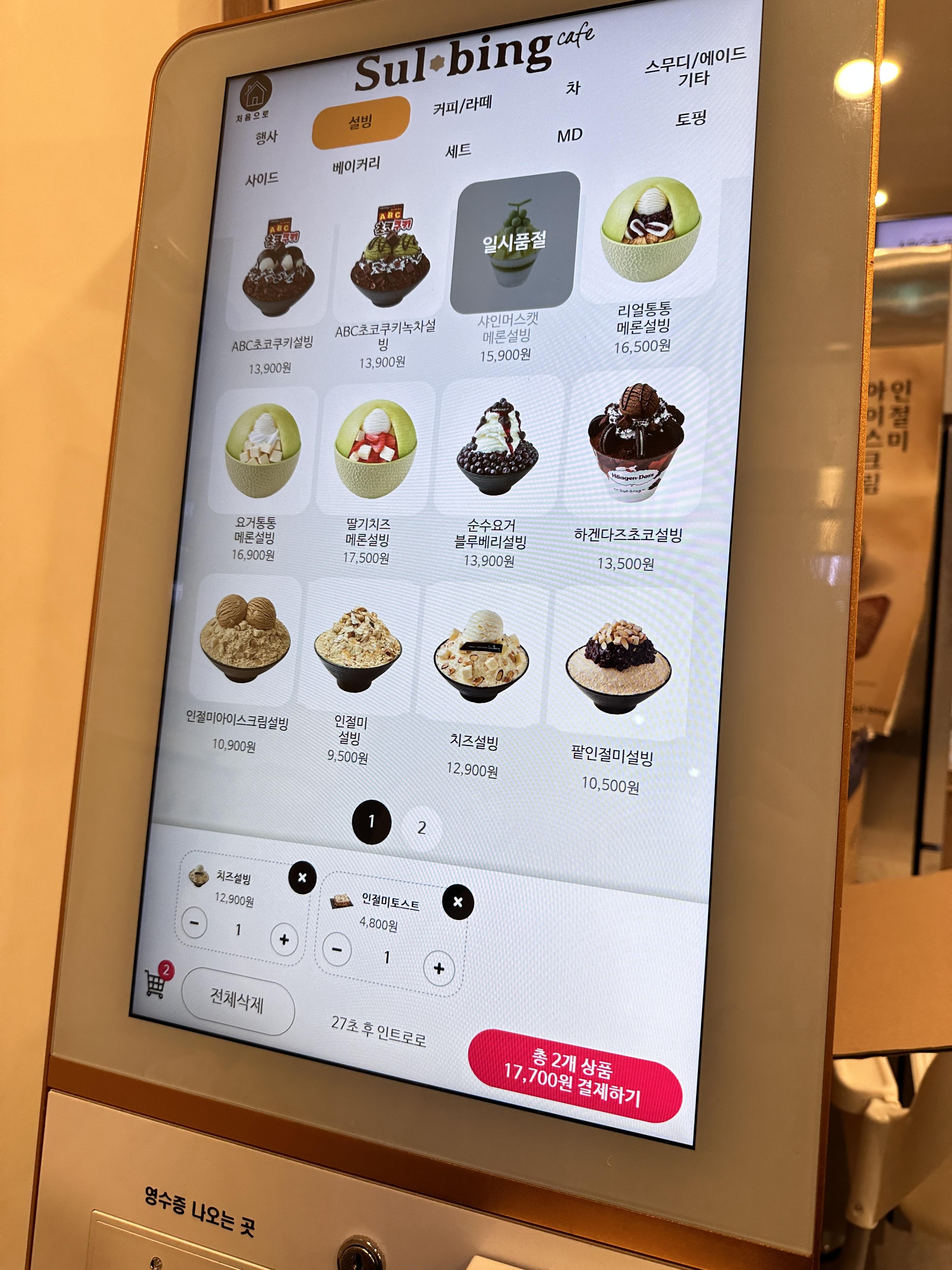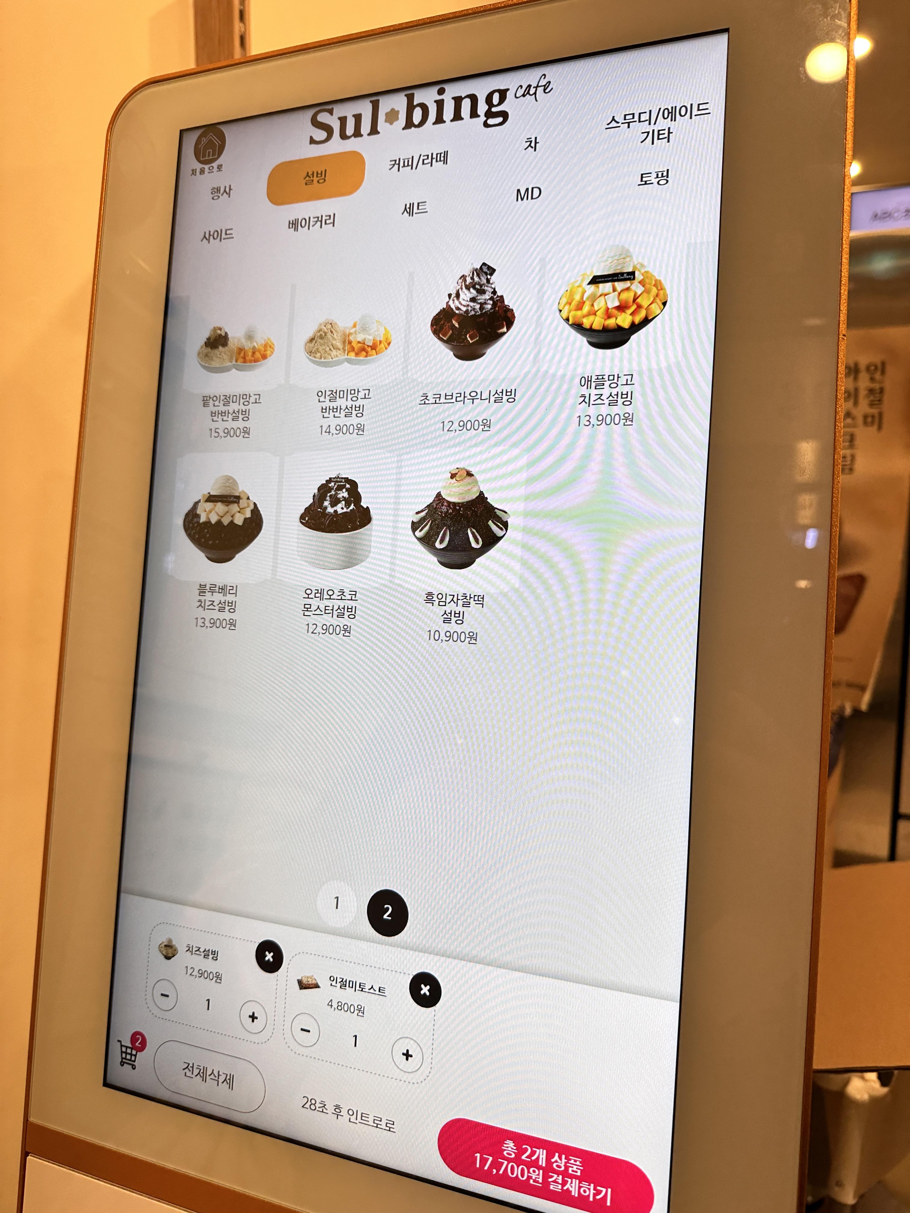설빙 주문은 매장내의 키오스크로 주문하면 됐고요. 설빙 빙수 메뉴 확인하시고요. 신메뉴로 보이는 ABC초코쿠키설빙이 제일 상단에 있었어요. 좀 요란한 빙수로 주문할까 고민했는데 칼로리를 생각해서 무난한 치즈설빙을 먹기로 했습니다. 설빙도 가격이 많이 올랐네요. 기본 인절미 설빙 가격도 9,500원이었고요. 치즈설빙 가격도 12,900원이었습니다.