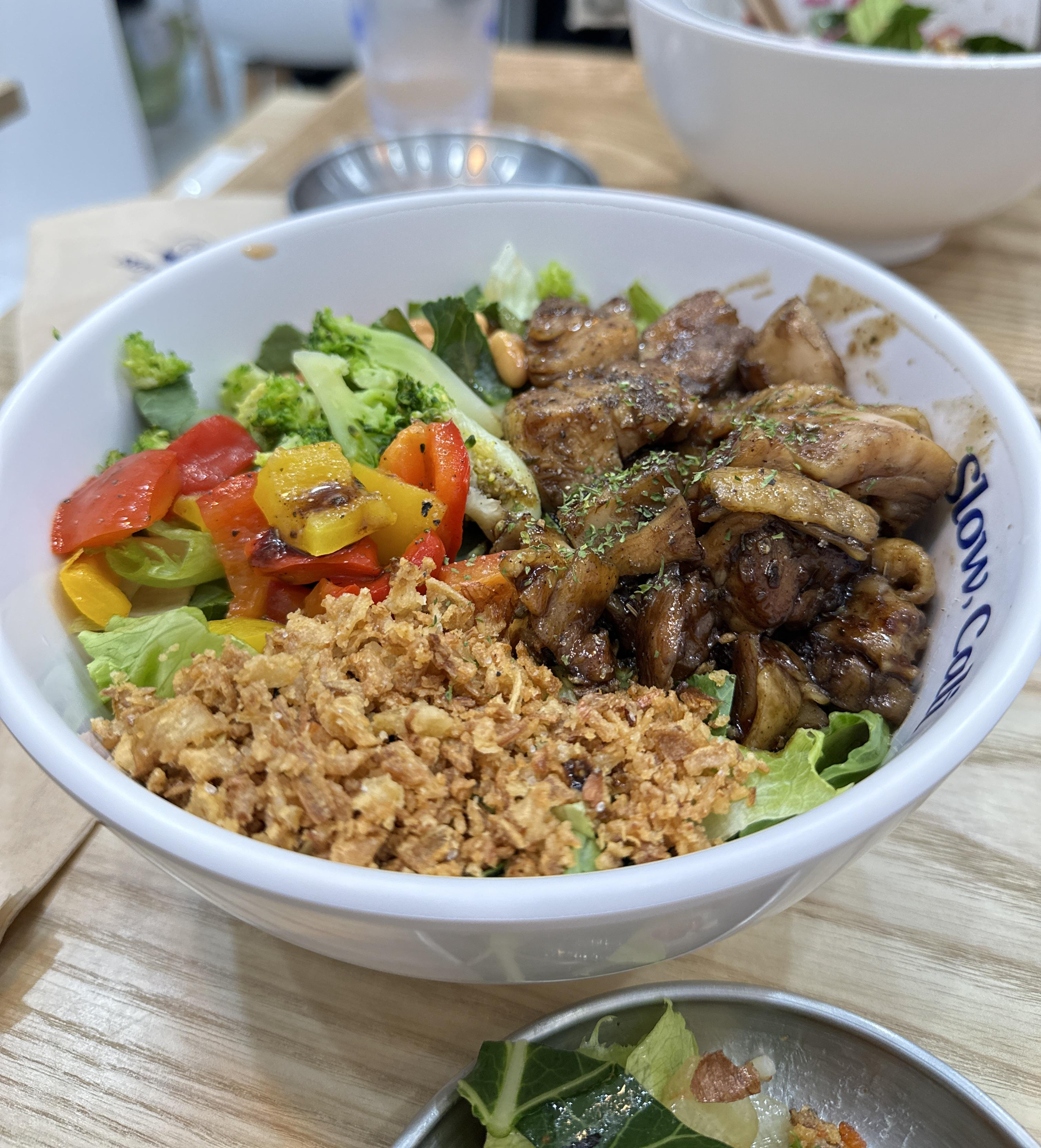 블랙페퍼 치킨 보울 이거 맛있네요! 슬로우 캘리에서 연어나 참치만 드셨으면 슬로우캘리 추천메뉴로 블랙페퍼 치킨 보울 추천드리고 싶네요. 데리야끼 소스맛이 나는 닭고기가 샐러드들과 잘 어울립니다! 회가 들어간 포케는 샐러드 같은 느낌이라면 블랙페퍼 치킨 보울은 더 식사 같은 느낌이네요. 포만감도 꽤 오래갔어요!