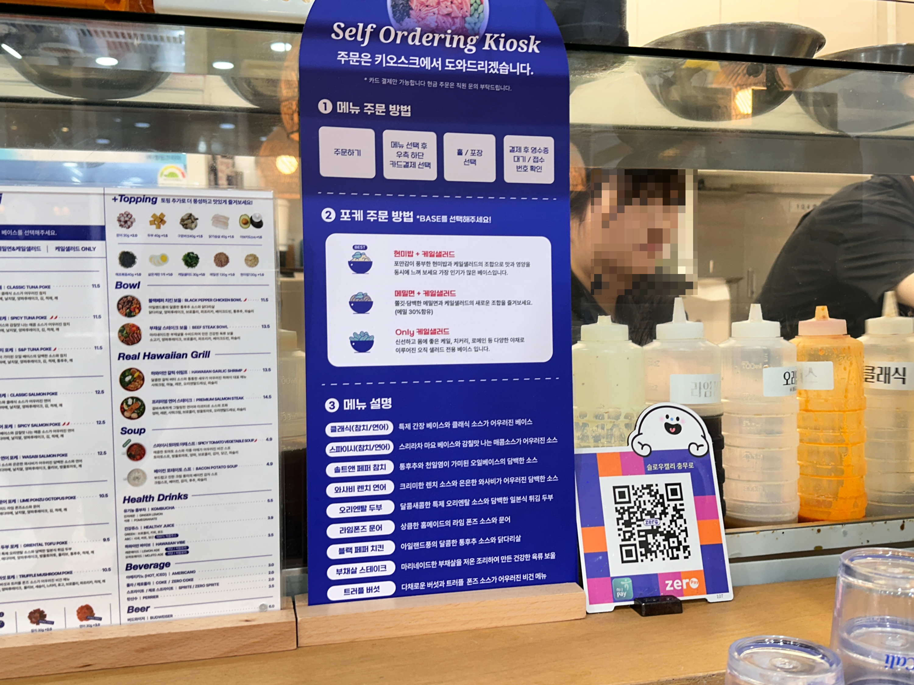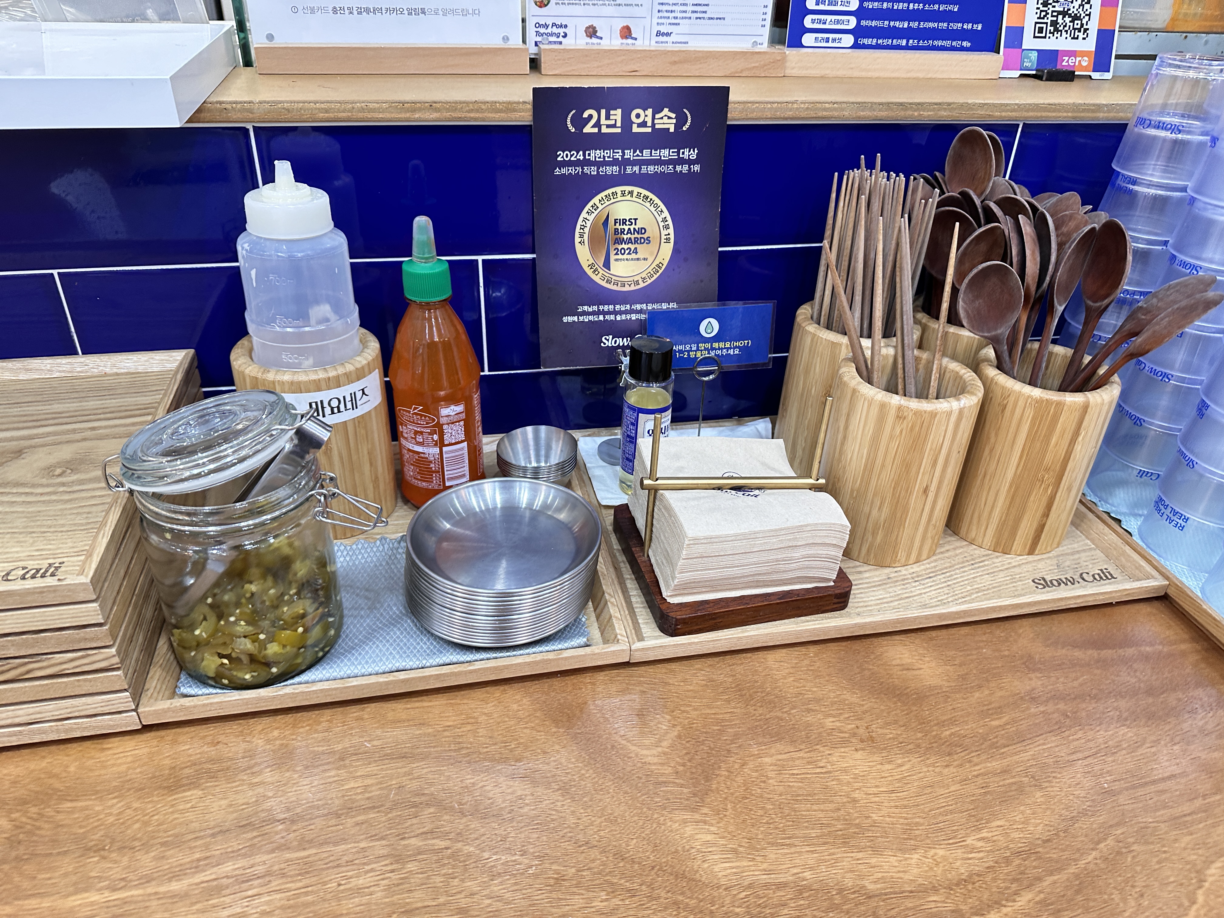 슬로우캘리 포케 주문방법도 매장에 안내가되어있고요. 주문은 키오스크로 했습니다. 셀프바에는 할라피뇨랑 수저가 있으니 사용하면 됐습니다. 슬로우캘리 셀프바에 와사비 오일이 있는데요. 저는 이 와사비 오일을 포케먹다가 좀 넣어서 먹어주는 편입니다. 느끼함을 잡아줘서 저는 좋더라고요. 추천드립니다.